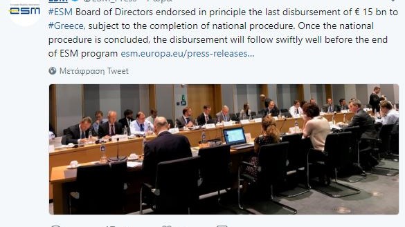 Εγκρίθηκε από το Συμβούλιο των Διευθυντών του ESM επί της αρχής η καταβολή της τελευταίας δόσης των 15 δισ. ευρώ προς την Ελλάδα, όπως έχει αναρτήσει στο Twitter ο ESM, με την προϋπόθεση να ολοκληρωθούν και οι εθνικές διαδικασίες.