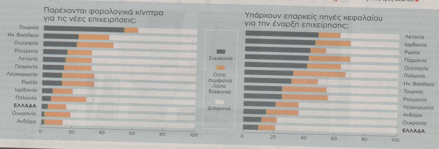 Ειδικότερα, στο ερώτημα σχετικά με το πόσο ευνοϊκό είναι το επιχειρηματικό σκηνικό για την προώθηση και την υλοποίηση επιχειρηματικών σχεδίων, η χώρα μας συγκέντρωσε το χαμηλό “σκορ” (46,2) στο σύνολο των 34 χωρών και βρέθηκε κάτω από τη Βενεζουέλα, την Ουκρανία, τη Γκάνα κλπ.