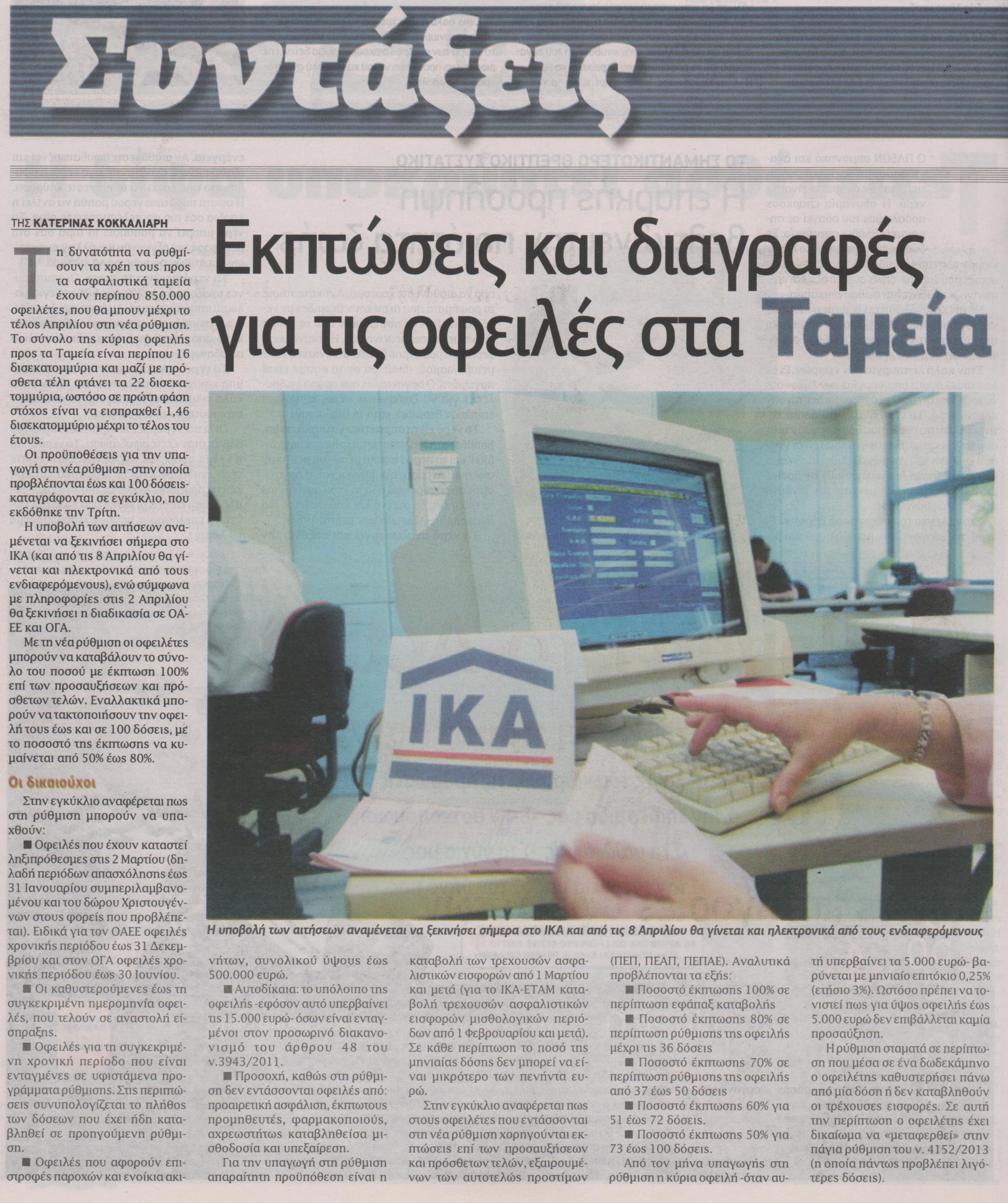 Οι προϋποθέσεις για την υπαγωγή στη νέα ρύθμιση-στην οποία προβλέπονται έως και 100 δόσεις- καταγράφονται σε εγκύκλιο, που εκδόθηκε την Τρίτη. Η υποβολή των αιτήσεων αναμένεται να ξεκινήσει σήμερα στο ΙΚΑ (και από τις 8 Απριλίου θα γίνεται και ηλεκτρονικά από τους ενδιαφερόμενους), ενώ σύμφωνα με πληροφορίες στις 2 Απριλίου θα ξεκινήσει η διαδικασία σε ΟΑΕΕ και ΟΓΑ.