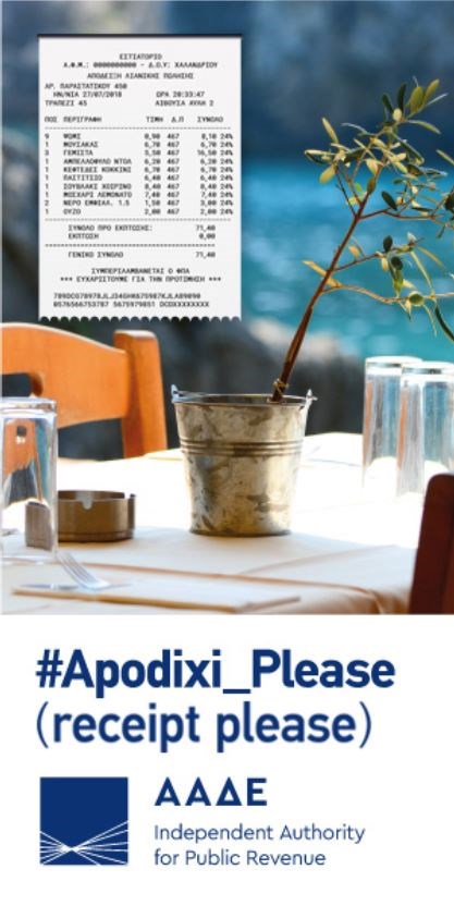 Εξάλλου, στις αφίσες που θα τοποθετηθούν στα αεροδρόμια, κάτω από μια ωραία φωτογραφία ενός τραπεζιού εστιατορίου – δίπλα στη θάλασσα, θα υπάρχει η εικόνα μιας νόμιμης απόδειξης, συνοδευόμενη από το εξής κείμενο (στα αγγλικά): “#Apodixi_Please (απόδειξη παρακαλώ). Καλώς ήλθατε στην Ελλάδα. Θα θέλαμε να σας ενημερώσουμε για τα καταναλωτικά δικαιώματά σας. Όλα τα ξενοδοχεία, εστιατόρια και καταστήματα υποχρεούνται να δέχονται χρεωστικές/πιστωτικές κάρτες. Δεν υποχρεούστε να πληρώσετε εάν δεν λάβετε απόδειξη. Γι’ αυτό, ζητήστε να πληρώσετε με κάρτα. Ζητήστε απόδειξη. Είναι τόσο απλό να το πείτε ελληνικά: #Apodixi_Please”-το μήνυμα της ΑΑΔΕ προς τους τουρίστες: https://www.aade.gr/apodixi.