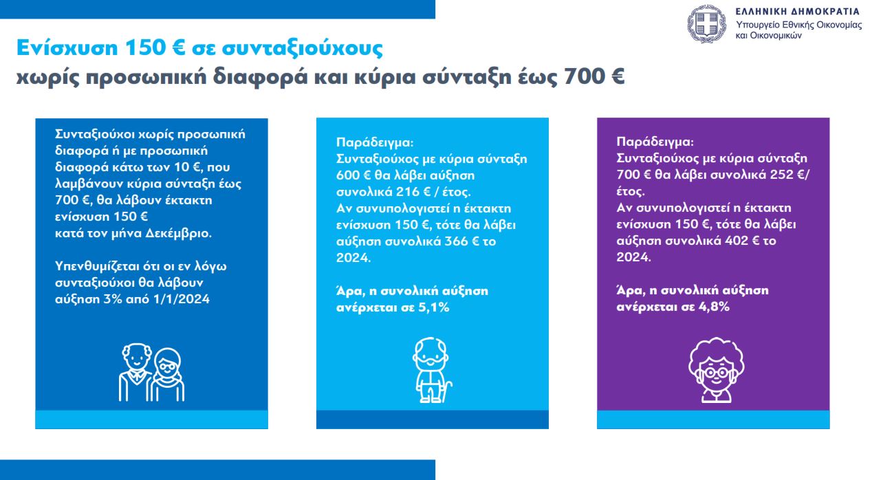 1,055 εκατ. συνταξιούχοι που δεν έχουν προσωπική διαφορά ή έχουν κάτω των 10 ευρώ και λαμβάνουν άθροισμα κυρίων συντάξεων έως 700 ευρώ, θα λάβουν έκτακτη ενίσχυση 150 ευρώ. Οι ίδιοι θα λάβουν αύξηση στις συντάξεις τους από 1-1-2024. Έτσι, ένας συνταξιούχος με αποδοχές 600 ευρώ θα λάβει συνολική αύξηση (έκτακτο επίδομα 150 ευρώ + αύξηση περίπου 3 % από 1.1.2024) σε ετήσια βάση 366 ευρώ ή 5,1 %. Την ίδια έκτακτη ενίσχυση (150 ευρώ) θα λάβουν τον Δεκέμβριο και οι 33.000 δικαιούχοι του επιδόματος ανασφάλιστου υπερήλικα.
