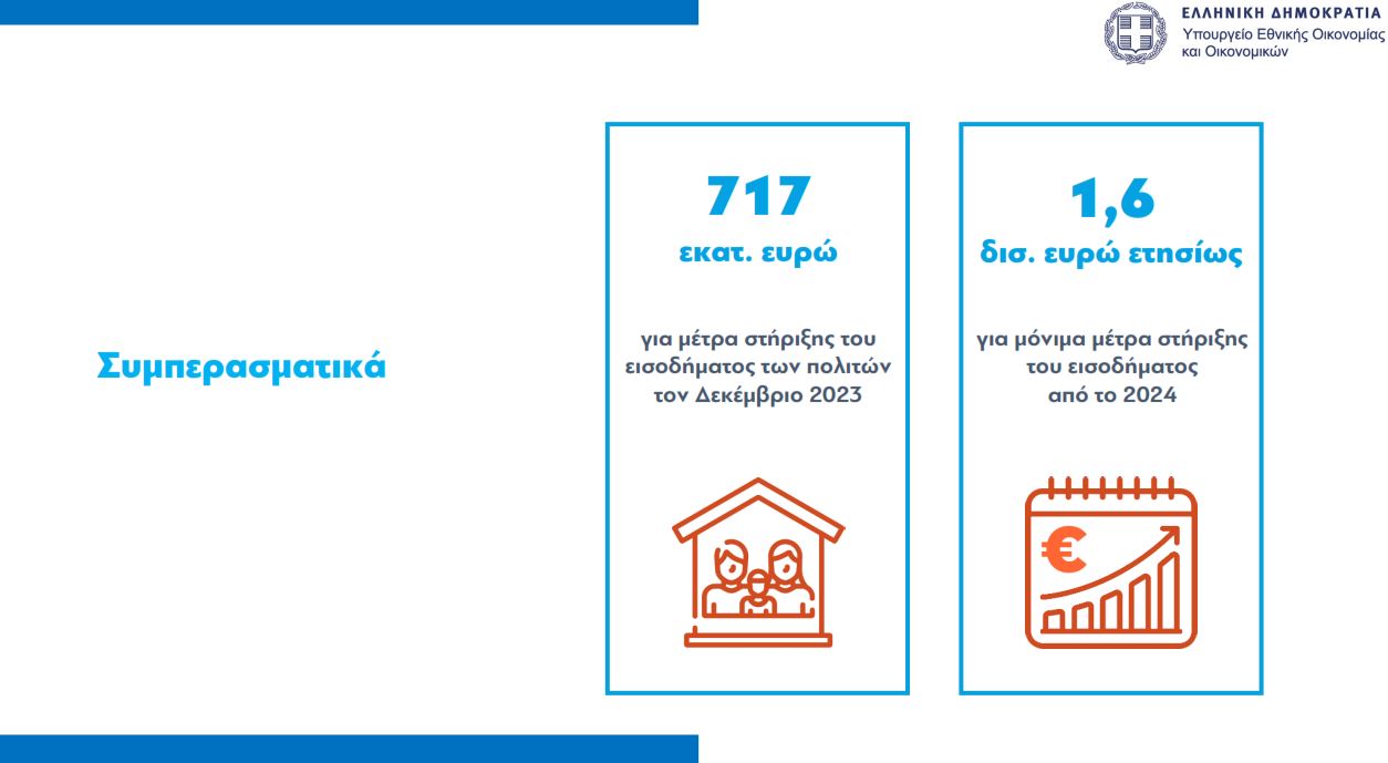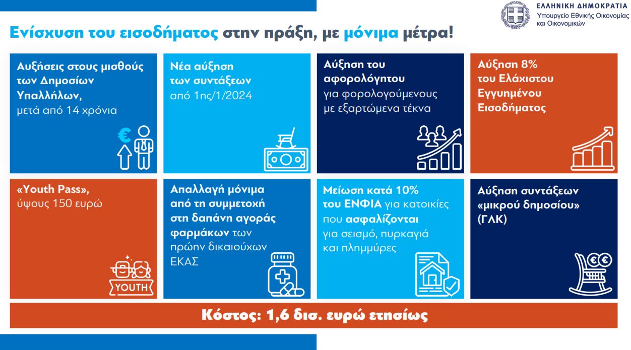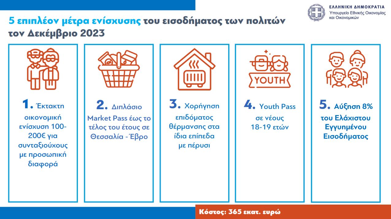 Το συνολικό κόστος των μέτρων ενίσχυσης του εισοδήματος των πολιτών το Δεκέμβριο διαμορφώνεται σε 717 εκατ. ευρώ ενώ η δαπάνη για τα μόνιμα μέτρα στήριξης του εισοδήματος των πολιτών από το 2024 (περιλαμβάνει τις αυξήσεις σε μισθούς-συντάξεις, αφορολόγητο για οικογένειες, ελάχιστο εγγυημένο εισόδημα, τη μείωση του ΕΝΦΙΑ για ασφαλιζόμενες κατοικίες, το Youth Pass και την απαλλαγή των πρώην δικαιούχων ΕΚΑΣ από τη συμμετοχή στη δαπάνη αγοράς φαρμάκων) διαμορφώνεται σε 1,6 δις. ευρώ ετησίως.