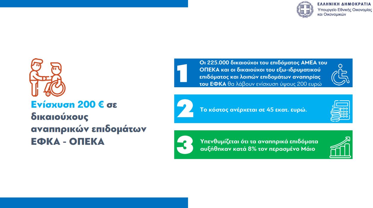 225.000 δικαιούχοι του επιδόματος ΑΜΕΑ του ΟΠΕΚΑ, του εξω-ιδρυματικού επιδόματος και λοιπών επιδομάτων αναπηρίας του e-ΕΦΚΑ  θα λάβουν ενίσχυση ύψους 200 ευρώ.