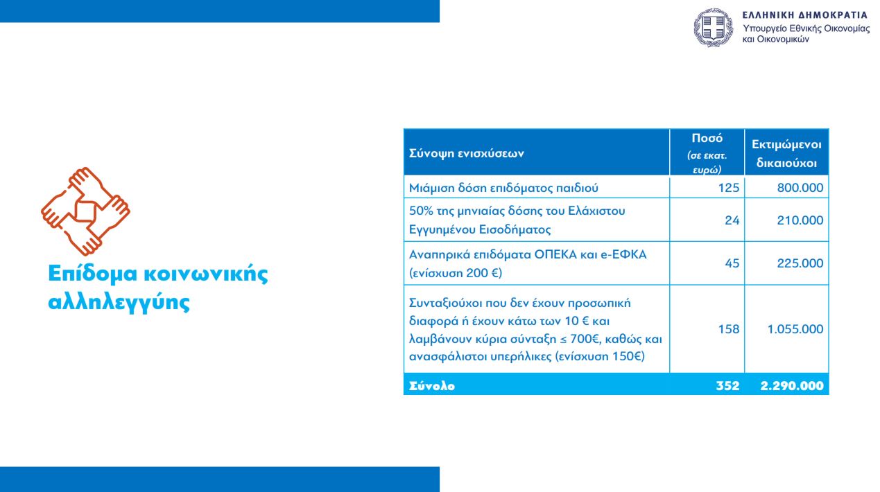 Οι έκτακτες  εισοδηματικές ενισχύσεις συνολικού ύψους 352 εκατ. ευρώ καταβάλλονται το Δεκέμβριο σε 2,3 εκατ. ευάλωτους πολίτες με χαμηλά εισοδήματα.
