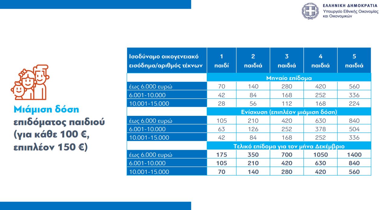 800.000 δικαιούχοι του επιδόματος παιδιού του ΟΠΕΚΑ, θα λάβουν επιπλέον μιάμιση δόση επιδόματος παιδιού. Ενδεικτικά το συνολικό ποσό (αρχικό ποσό συν επιπλέον μιάμιση δόση) που θα λάβει το Δεκέμβριο μια οικογένεια με τρία παιδιά κυμαίνεται από 280 έως 700 ευρώ.