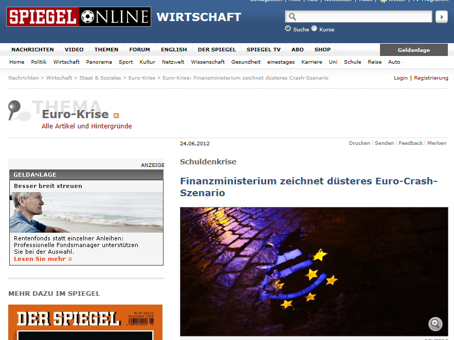 «Το υπουργείο Οικονομικών παρουσιάζει ένα ζοφερό σενάριο για την κατάρρευση του ευρώ» είναι ο τίτλος του γερμανικού περιοδικού Spiegel, το οποίο αναφέρεται σε έκθεση-κόλαφο του γερμανικού υπουργείου Οικονομικών, όπου εξετάζεται το σενάριο κατάρρευσης της Ευρωζώνης.«Η ανάπτυξη θα κατέρρεε μαζικά, ενώ η ανεργία θα αυξανόταν σε μεγαλύτερο αριθμό πολιτών από πέντε εκατομμύρια. Σύμφωνα με πληροφορίες του Spiegel, το γερμανικό Υπουργείο Οικονομικών παρουσιάζει έκθεση, στην οποία εξετάζεται το σενάριο κατάρρευσης της Ευρωζώνης. Η εν λόγω εξέλιξη θα είχε καταστροφικές συνέπειες για την οικονομία της Γερμανίας» αναφέρει το δημοσίευμα.