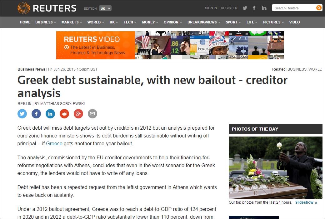 ‘To ελληνικό χρέος δεν θα φτάσει στον στόχο που είχαν θέσει οι πιστωτές το 2012 όμως μια ανάλυση που δόθηκε στους υπουργούς Οικονομικών της Ευρωζώνης δείχνει ότι το χρέος παραμένει βιώσιμο χωρίς διαγραφή- εάν η Ελλάδα λάβει ένα ακόμη τριετούς πακέτο διάσωσης τριών ετών”, αναφέρει το Reuters.