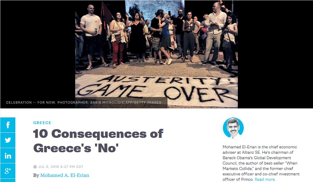 Ακολουθώντας τη συμβουλή της κυβέρνησης και ψηφίζοντας “όχι” στο δημοψήφισμα της Κυριακής, οι Έλληνες πολίτες έστειλαν ένα σαφές μήνυμα, αναφέρει ο οικονομολόγος Μοχάμεντ Ελ Εριάν.