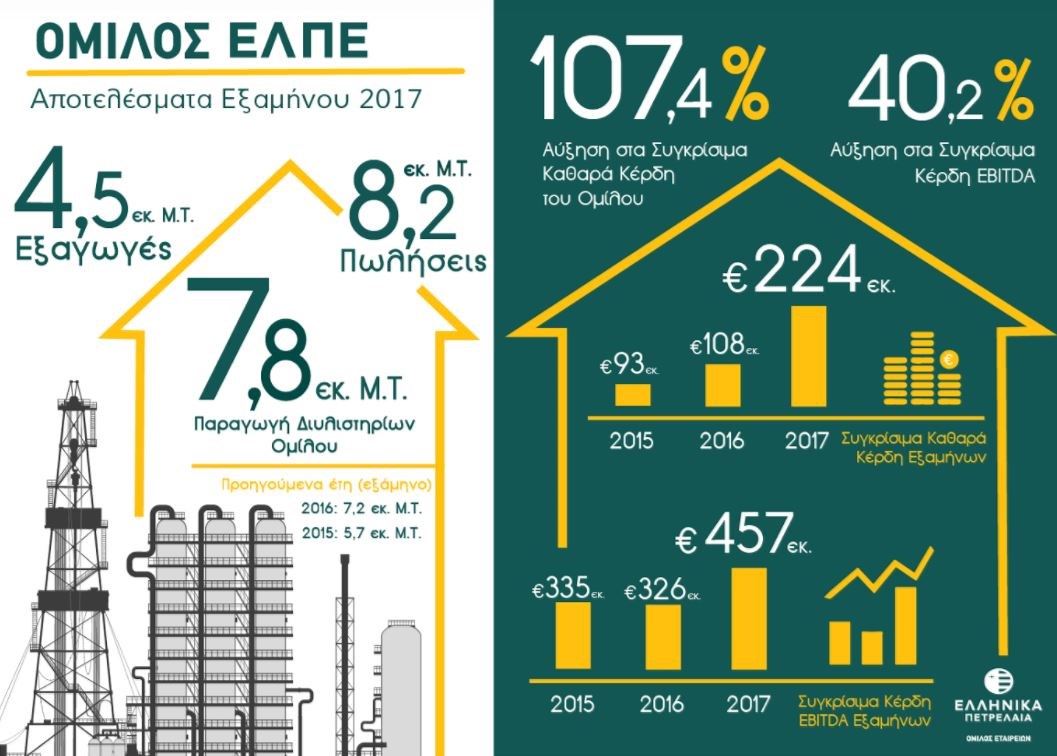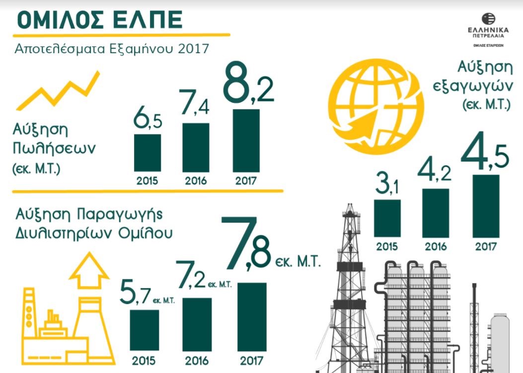 Κύριοι λόγοι για τα πολύ καλά αποτελέσματα, αποτελούν τα υψηλά περιθώρια διύλισης, η αυξημένη υπερ-απόδοση σε σχέση με τα ενδεικτικά περιθώρια, λόγω κυρίως εκμετάλλευσης ευκαιριών στην αγορά αργών, αλλά και της βελτιωμένης λειτουργίας και υψηλής παραγωγής των διυλιστηρίων. Ενδεικτικά, η παραγωγή και οι πωλήσεις των διυλιστηρίων του Ομίλου σημείωσαν νέα αύξηση το Β’ τρίμηνο του 2017, με τις συνολικές πωλήσεις στα 4.3 εκατ. τόνους (έναντι 4 εκατ. τόνων το 2016), αυξημένες κατά 7%. Για το σύνολο του Α΄ Εξαμήνου 2017 οι όγκοι πωλήσεων έφθασαν στους 8,3 εκατ. τόνους έναντι 7,4 εκατ. τόνων το 2016, με τις εξαγωγές να αυξάνονται κατά 7% (από 4,2 εκατ. τόνους σε 4,5 εκατ. τόνους), συνεισφέροντας το 55% των συνολικών πωλήσεων. Σημαντική αύξηση σημείωσαν οι πωλήσεις εσωτερικής αγοράς και ναυτιλιακών και αεροπορικών καυσίμων κατά 20% και 19%, ενώ και οι όγκοι προς βιομηχανικούς πελάτες αυξήθηκαν.