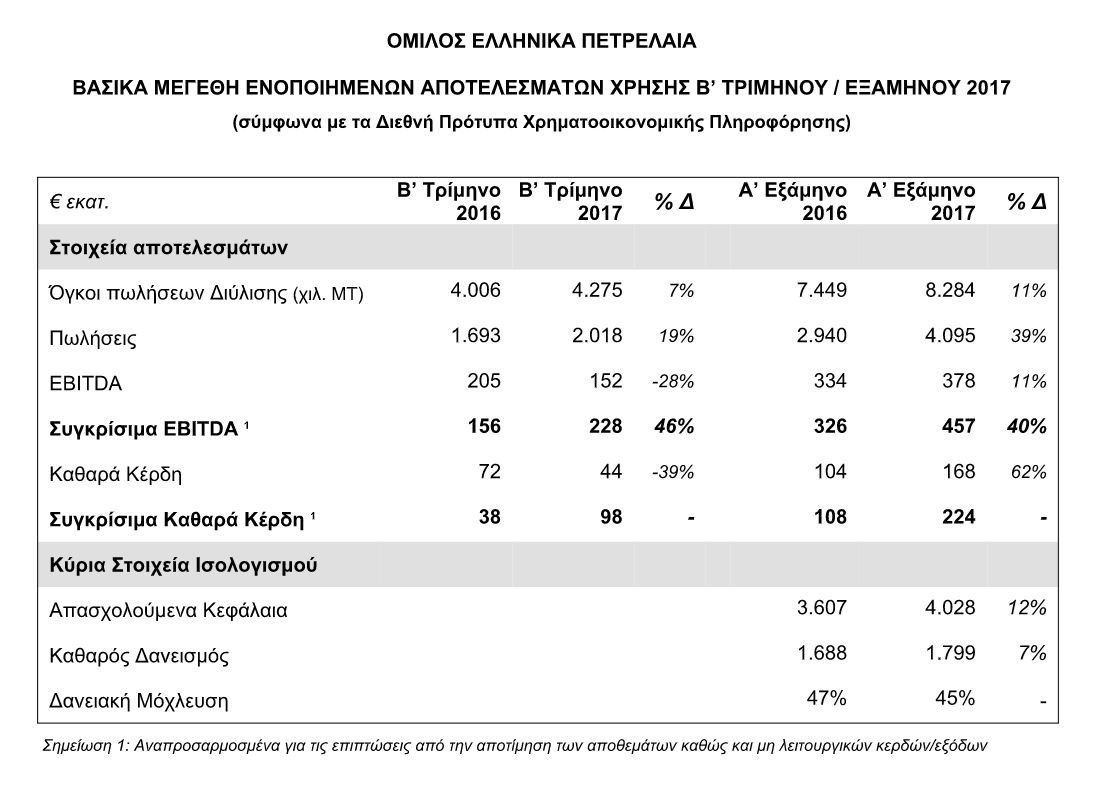 – Τα Συγκρίσιμα Καθαρά Κέρδη του Β’ Τριμήνου ανήλθαν στα €98 εκατ. έναντι €38 εκατ. το αντίστοιχο Τρίμηνο του 2016, οδηγώντας τα αντίστοιχα για το Α’ Εξάμηνο 2017 στα €224 εκατ, έναντι €108 εκατ. (αύξηση 107% για το εξάμηνο). Οι επιδόσεις του κλάδου Διύλισης, Εφοδιασμού και Εμπορίας ήταν ο σημαντικότερος παράγοντας βελτίωσης των αποτελεσμάτων, ενώ και η Εμπορία σημείωσε βελτιωμένες επιδόσεις.
