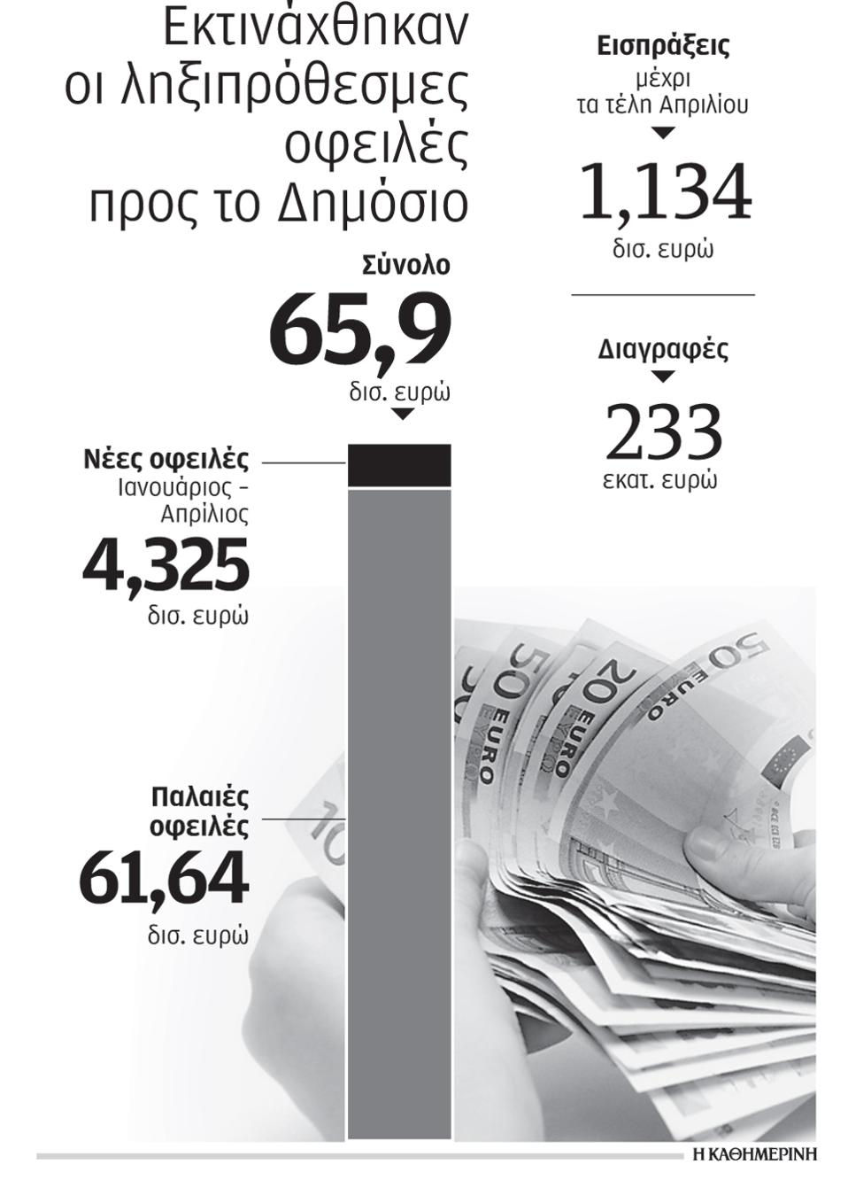 1. Από την αρχή του χρόνου έως τον Απρίλιο οι οφειλές προς το Δημόσιο έφτασαν στα 4,325 δισ. ευρώ, τα οποία προστίθενται στο stock των 61,64 δισ. ευρώ των παλαιότερων οφειλών.