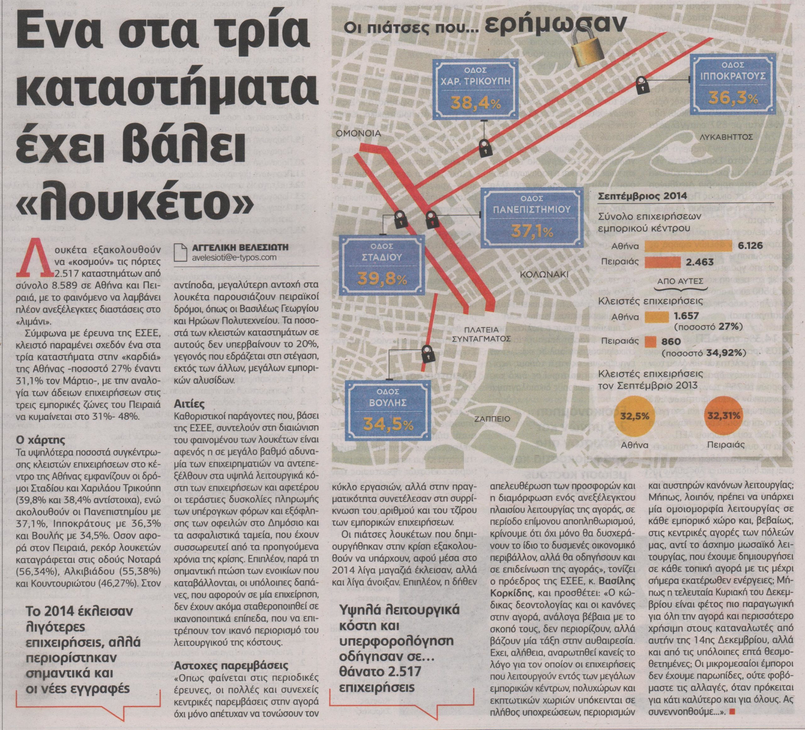 Σύμφωνα με έρευνα της ΕΣΕΕ, κλειστό παραμένει σχεδόν ένα στα τρία καταστήματα στην «καρδιά» της Αθήνας –ποσοστό 27% έναντι 31,1% τον Μάρτιο-, με την αναλογία των άδειων επιχειρήσεων στις τρεις εμπορικές ζώνες του Πειραιά να κυμαίνεται στο 31%-48%.