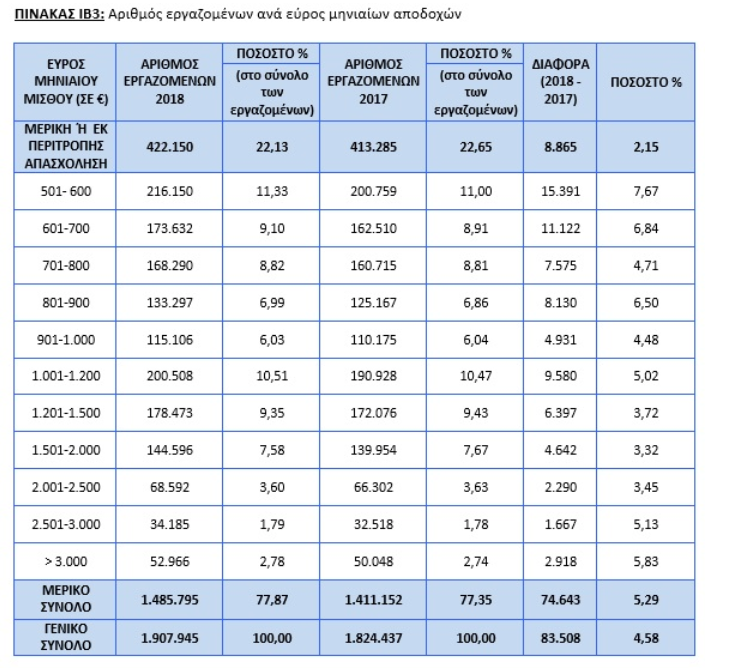 Από τα στοιχεία της έκδοσης προκύπτει ότι συνολικά 422.150 εργαζόμενοι απασχολούνται με μερική ή εκ περιτροπής εργασία και άλλοι 216.150 εργαζόμενοι πλήρους απασχόλησης αμείβονται με μισθό από 501 ευρώ έως 600 ευρώ το 2018. Δηλαδή, συνολικά 638 χιλιάδες στο σύνολο των 1,9 εκατ. εργαζομένων έχουν αμοιβές κάτω των 600 ευρώ τον μήνα.