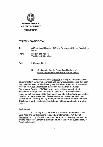 Το έγγραφό του υπουργείου Οικονομικών φέρει ημερομηνία 25 Αυγούστου και την υπογραφή του Ευάγγελου Βενιζέλου, είναι γραμμένο στα Αγγλικά και είναι αυστηρά εμπιστευτικό, απευθυνόμενο προς όλους τους κατόχους ελληνικών κρατικών ομολόγων και ομολόγων του ΟΣΕ. Τι λέει; Ότι περιορίζει την πρόσβαση σε πληροφορίες για τους κατόχους των CDS. Συγκεκριμένα αναφέρει ότι η ελληνική δημοκρατία, ενεργώντας σε συνεργασία με τις κυβερνήσεις της Ευρωζώνης και άλλες κυβερνήσεις, ζητά από τον κάθε κάτοχο ελληνικών κυβερνητικών ομολόγων ή ομολόγων που έχουν εκδοθεί από τον ΟΣΕ να αναφέρουν στο αρμόδιο εθνικό τους οργανισμό τι ομόλογα κατείχαν μέχρι τις 30/6/2011/. Κάθε τέτοιο report, όπως αναφέρει το έγγραφο, “θα κρατηθεί εμπιστευτική και μόνο συνολικά στοιχεία θα είναι διαθέσιμα στην Ελλάδα και άλλους ενδιαφερόμενους”.