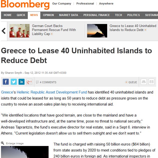 Το Βloomberg μόλις δημοσίευσε άρθρο πως είναι έτοιμος ο κατάλογος για την ενοικίαση 40 ακατοίκητων νησιών και βραχονησίδων στην Ελληνική Επικράτεια.Το Ταμείο Αξιοποίησης Ιδιωτικής Περιουσίας του Δημοσίου (ΤΑΙΠΕΔ) έχει εντοπίσει 40 ακατοίκητα νησιά και νησίδες, τα οποία θα μπορούσαν να ενοικιασθούν για ένα διάστημα έως 50 έτη και να αξιοποιηθούν ως τουριστικά θέρετρα. Ο εκτελεστικός διευθυντής του Ταμείου, Ανδρέας Ταπραντζής, έδωσε μία συνέντευξη στις 6 Σεπτεμβρίου στο Bloomberg και σήμερα το γνωστό πρακτορείο δημοσίευσε δηλώσεις του. «Βρήκαμε τοποθεσίες που έχουν καλό έδαφος, είναι κοντά στην ηπειρωτική χώρα, διαθέτουν καλά αναπτυγμένες υποδομές και δεν αποτελούν κανένα κίνδυνο για την εθνική ασφάλεια», δήλωσε ο κ. Ταπραντζής. Επίσης ανέφερε πως ο κατάλογος περιλαμβάνει νησιά με έκταση από 500 χιλιάδες τετραγωνικά μέτρα έως 3 εκατομμύρια τετραγωνικά μέτρα, τα οποία μπορούν να αξιοποιηθούν ως υψηλού επιπέδου ολοκληρωμένα τουριστικά θέρετρα με ενοικίασή τους από 30 έως 50 έτη.Η πώληση νησιών έχει αποκλεισθεί, δήλωσε ο κ. Ταπραντζής, επειδή τα έσοδα για το ελληνικό δημόσιο δεν θα ήταν μεγαλύτερα από τις συμφωνίες ενοικίασης, και πρόσθεσε πως η Ελλάδα θα προσελκύσει περισσότερες επενδύσεις, αν ένα νησί αξιοποιηθεί ως τουριστικό θέρετρο.