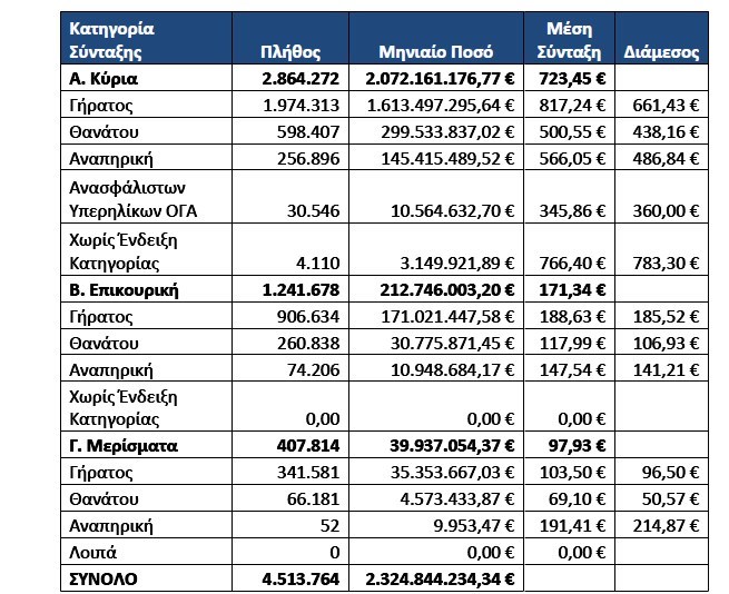 Να σημειωθεί ότι προ Μνημονίων και ειδικότερα το έτος 2009, η μέση κύρια σύνταξη ήταν ύψους 1.080 ευρώ, η μέση επικουρική 343 ευρώ και το μέσο μέρισμα 164 ευρώ!