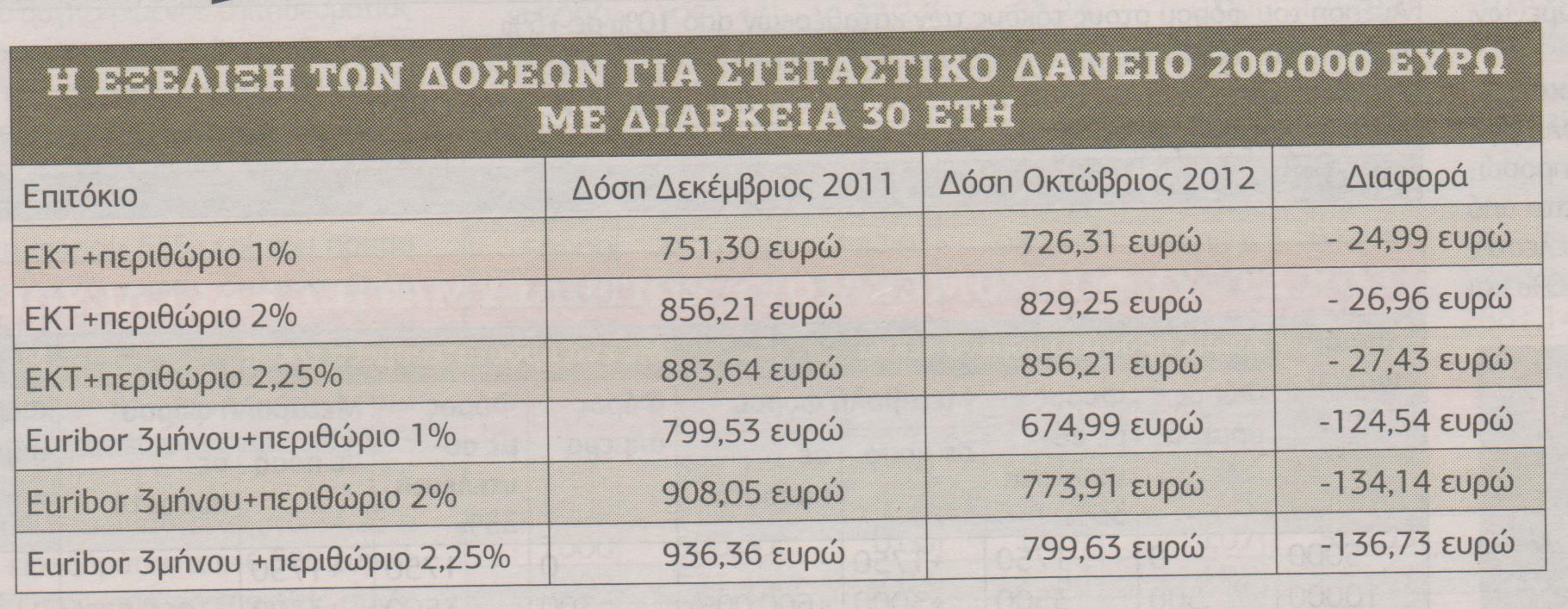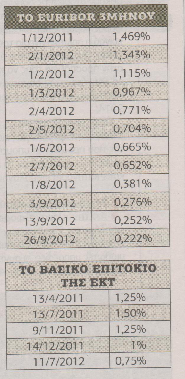 Σε ιστορικά χαμηλά βρίσκονται τους τελευταίους μήνες τα επιτόκια των στεγαστικών δανείων λόγω της ραγδαίας πτώσης του ευρωπαϊκού διατραπεζικού επιτοκίου euribor.Οι δανειολήπτες που έλαβαν δάνειο από το 2004 και μετά μπορούν να δουν στο ενημερωτικό σημείωμα των δόσεών τους επιτόκια ακόμη και 1%.Αυτό σημαίνει ότι κάθε μήνα λαμβάνουν μια ανάσα στα οικονομικά τους, που μπορεί να ξεπερνά και τα 150-200 ευρώ ανάλογα με το ύψος και τη διάρκεια του δανείου, καθώς αποπληρώνουν χαμηλότερη δόση. ΠΑΤΗΣΤΕ ΕΠΑΝΩ ΓΙΑ ΜΕΓΑΛΥΤΕΡΗ ΑΝΑΛΥΣΗ