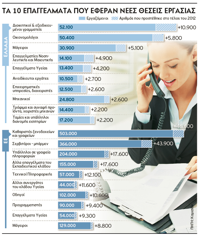Σύμφωνα με τα στοιχεία της Κομισιόν στο δ’ τρίμηνο του 2012 οι προσλήψεις στην Ελλάδα αυξήθηκαν κατά 27% έναντι του αντίστοιχου διαστήματος του αμέσω�� προηγούμενου έτους με τη χώρα μας να καταγράφει «πρωτιά» στην Ευρώπη. Ανάμεσα στα επαγγέλματα με τον μεγαλύτερο ρυθμό προσλήψεων είναι οι εξειδικευμένοι γραμματείς, οι οικονομολόγοι και οι μάγειρες.