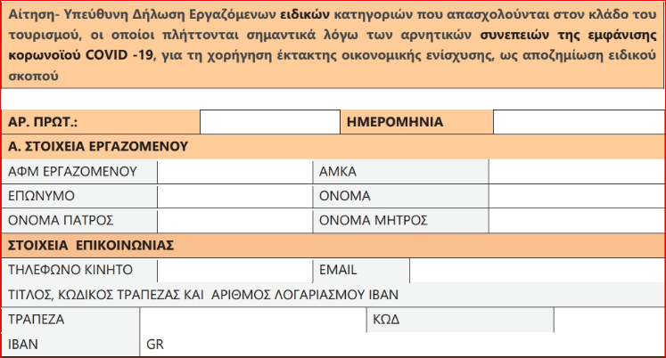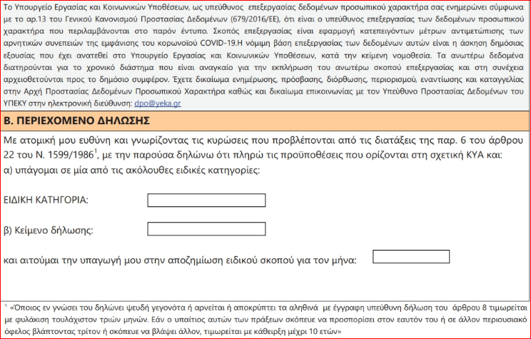 1. Οι δικαιούχοι του άρθρου 1 για τη χορήγηση της αποζημίωσης ειδικού σκοπού του άρθρου 2, υποβάλλουν υποχρεωτικά υπεύθυνη δήλωση του ν. 1599/1986 (Α’ 75) στο Π.Σ ΕΡΓΑΝΗ, στο ειδικό έντυπο του Παραρτήματος, με τίτλο: «Αίτηση -Υπεύθυνη Δήλωση Εργαζόμενων ειδικών κατηγοριών που απασχολούνται στον κλάδο του τουρισμού, οι οποίοι πλήττονται σημαντικά λόγω των αρνητικών συνεπειών της εμφάνισης κορονοϊού COVID -19, για τη χορήγηση έκτακτης οικονομικής ενίσχυσης, ως αποζημίωση ειδικού σκοπού», η οποία συνιστά ταυτοχρόνως και υπεύθυνη δήλωση του ν. 1599/ 1986 (Α’ 75), ανά μήνα, για τους μήνες Ιανουάριο και Φεβρουάριο 2021, στην ηλεκτρονική πλατφόρμα του ειδικού μηχανισμού στήριξης των εργαζομένων (supportemployees.services.gov.gr) του Υπουργείου Εργασίας και Κοινωνικών Υποθέσεων, χωρίς να απαιτείται υπεύθυνη δήλωση εργοδότη.