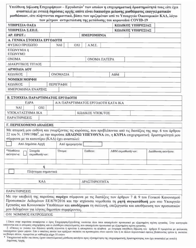 Για τις επιχειρήσεις η πλατφόρμα άνοιξε από το βράδυ της 24ης Μαρτίου, ενώ η ΕΡΓΑΝΗ παρέχει και οδηγίες συμπλήρωσης του εντύπου. Σύμφωνα με τον Οδηγό, στο έντυπο οι πληττόμενες επιχειρήσεις συμπληρώνουν την «Υπεύθυνη Δήλωση Επιχειρήσεων – Εργοδοτών των οποίων η επιχειρηματική δραστηριότητά τους είτε έχει ανασταλεί με εντολή δημόσιας αρχής οπότε είναι δικαιούχοι μείωσης μισθώματος επαγγελματικών μισθώσεων, είτε πλήττονται σημαντικά, βάσει των οριζομένων από το Υπουργείο Οικονομικών ΚΑΔ, λόγω των μέτρων αντιμετώπισης της μετάδοσης του κορονοϊού COVID-19».