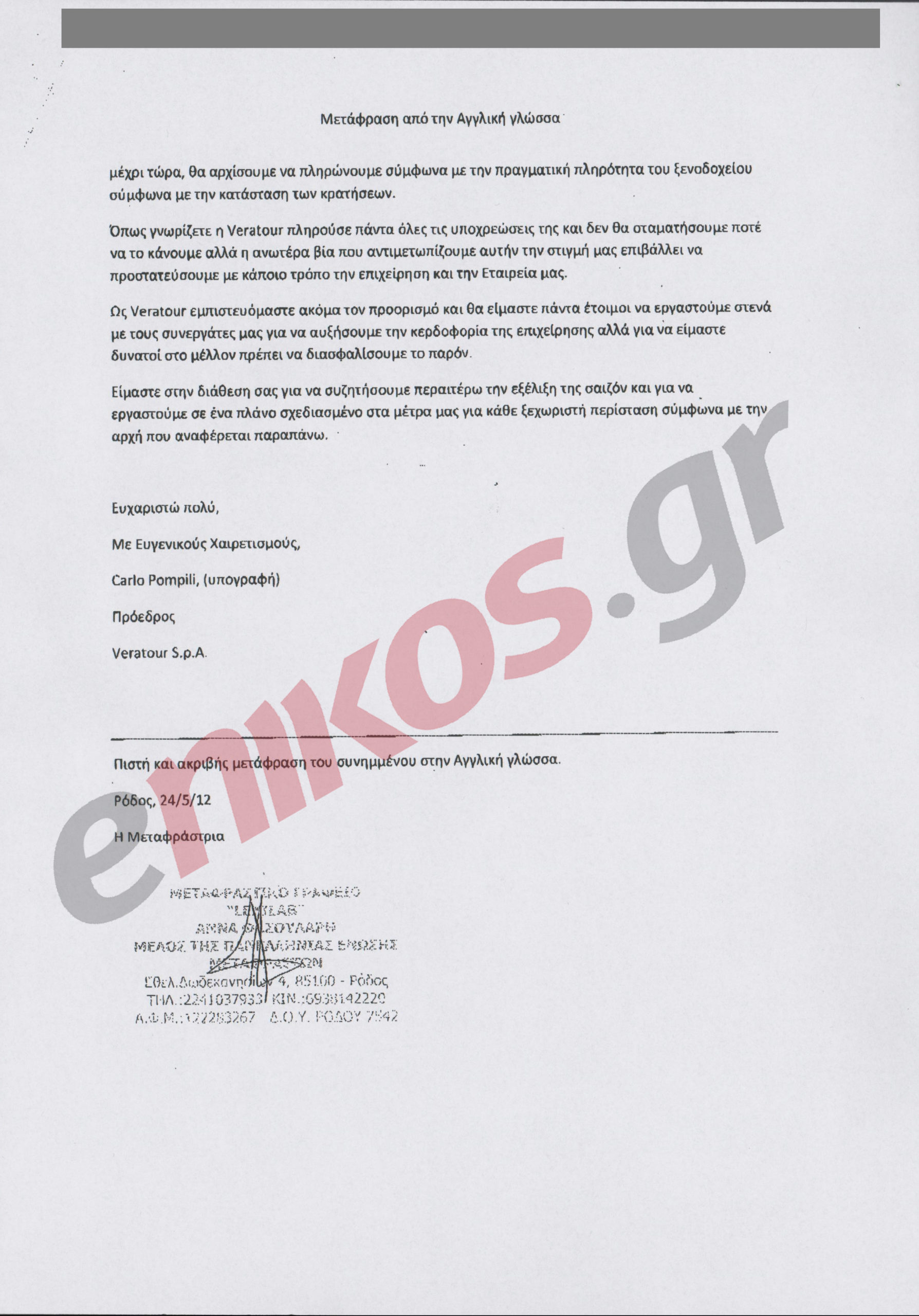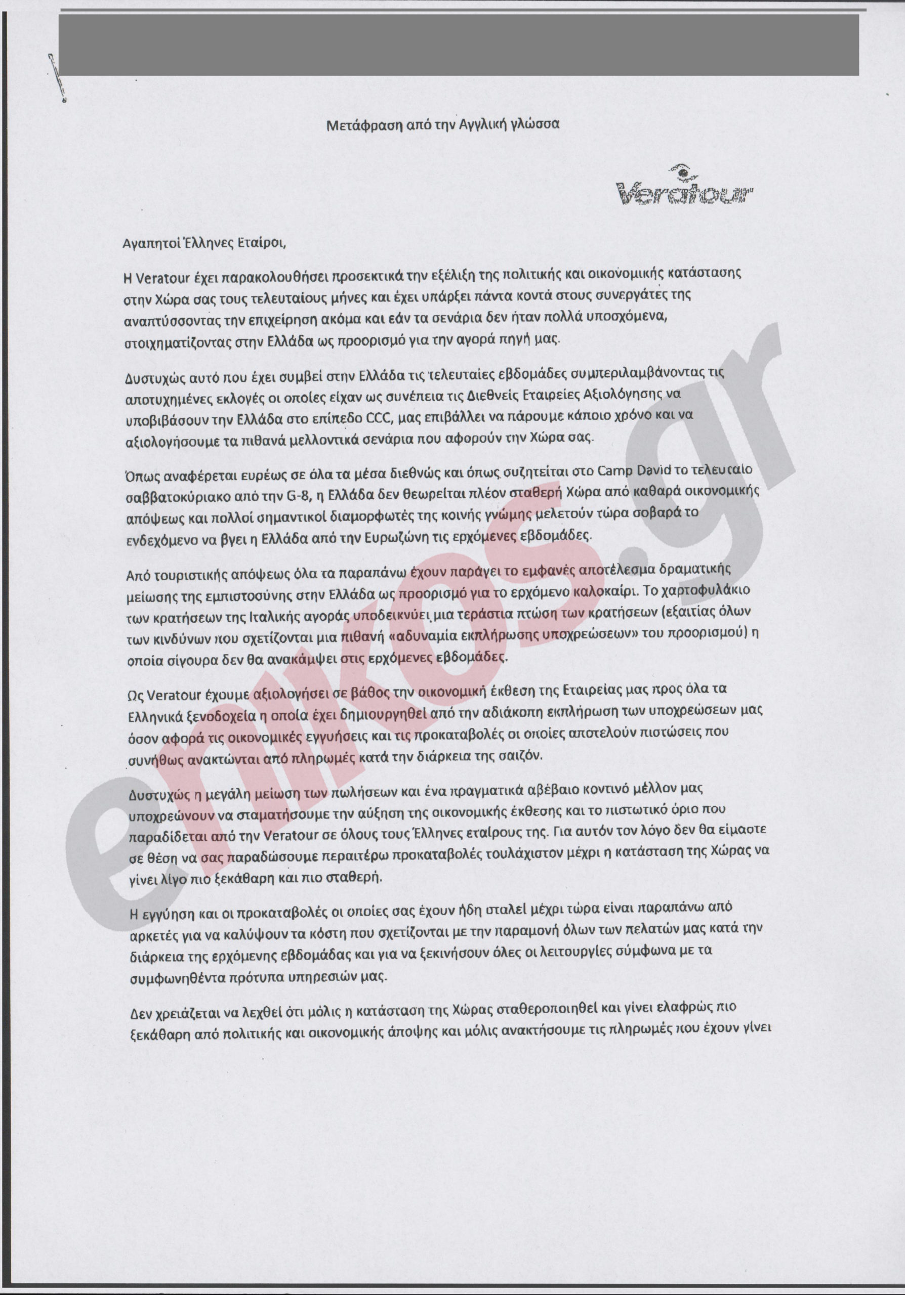 Στη δισέλιδη επιστολή που έστειλε η Ιταλική εταιρεία στα ελληνικά ξενοδοχεία, γίνεται λόγος για ”δραματική μείωση της εμπιστοσύνης στην Ελλάδα ως χώρας προορισμού για το ερχόμενο καλοκαίρι” και σπάζοντας τις δεσμεύσεις, που απορρέουν από συμβόλαια αποκλειστικής συνεργασίας, τα οποία έχει υπογράψει με τους ξενοδόχους, κοινοποιεί απλά: ”δεν θα είμαστε σε θέση να σας παραδώσουμε περαιτέρω προκαταβολή τουλάχιστον μέχρι η κατάσταση της χώρας να γίνει λίγο πιο ξεκάθαρη και πιο σταθερή”. ”Δυστυχώς, αυτό που έχει συμβεί στην Ελλάδα τις τελευταίες εβδομάδες συμπεριλαμβάνοντας τις αποτυχημένες εκλογές, οι οποίες είχαν ως συνέπεια οι Διεθνείς Εταιρείες Αξιολόγησης να υποβιβάσουν την Ελλάδα στο επίπεδο CCC, μας επιβάλλει να πάρουμε κάποιο χρόνο και να αξιολογήσουμε τα πιθανά μελλοντικά σενάρια, που αφορούν τη χώρας σας”, υποστηρίζει στην επιστολή του ο πρόεδρος της εταιρείας C.Pompili. “‘Όπως αναφέρεται ευρέως σε όλα τα μέσα διεθνώς και όπως συζητείται στο Camp David το τελευταίο Σαββατοκύριακο από την G8, η Ελλάδα δεν θεωρείται πλέον σταθερή χώρα από οικονομικής απόψεως και πολλοί σημαντικοί διαμορφωτές της κοινής γνώμης μελετούν σοβαρά το ενδεχόμενο να βγει η Ελλάδα από την Ευρωζώνη τις ερχόμενες εβδομάδες”, προσθέτει. Χαρακτηριστικό είναι μάλιστα ότι στην επιστολή αναφέρεται πως “η μεγάλη μείωση των πωλήσεων και ένα πραγματικό αβέβαιο κοντινό μέλλον μας υποχρεώνουν να σταματήσουμε την αύξηση της οικονομικής έκθεσης και το πιστωτικό όριο που παραδίδεται από τη Veratour σε όλους τους Έλληνες εταίρους της. Γι αυτόν τον λόγο, η εταιρεία, επισημαίνει ότι δεν θα παραδώσει περαιτέρω προκαταβολές τουλάχιστον μέχρι η κατάσταση της χώρας να γίνει λίγο πιο ξεκάθαρη και σταθερή. Διαβάστε ολόκληρη την επιστολή-ντοκουμέντο