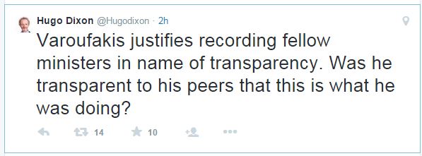 “O Βαρουφάκης δικαιολογεί την ενέργεια ηχογράφησης των συνάδελφων του στο Eurogroup επικαλούμενος την διαφάνεια. Ήταν ο ίδιος διαφανής προς τους συναδέλφους του ενημερώνοντας τους για αυτό που έκανε;” αναρωτιέται ο δημοσιογράφος του Reuters.