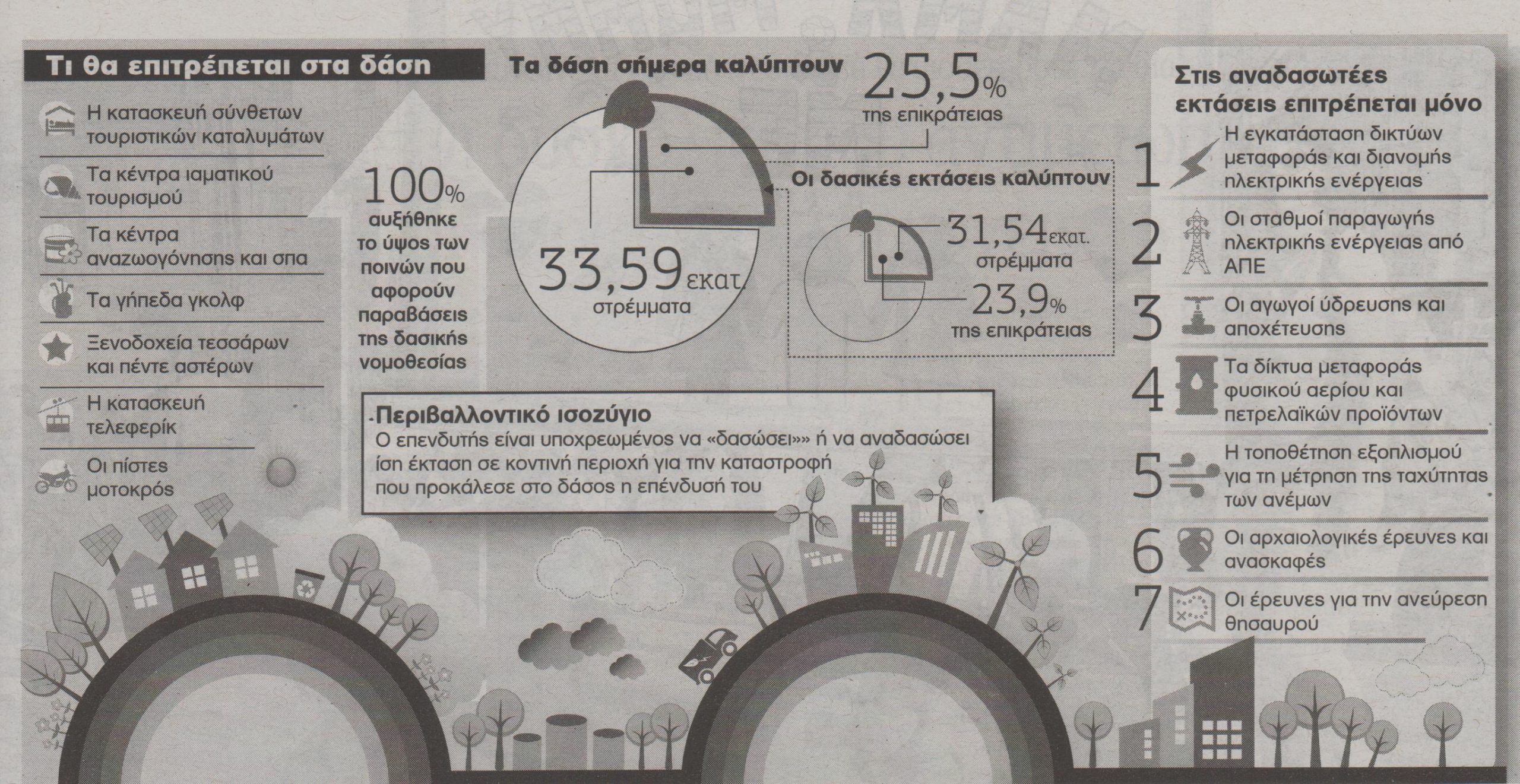 Όπως λένε από το υπουργείο Περιβάλλοντος, «με τις ρυθμίσεις που προωθούνται, όποιο κομμάτι δάσους καταστραφεί από τις παρεμβάσεις θα ξαναφτιαχθεί με ευθύνη των ίδιων των επενδυτών». Την ίδια ώρα, στις αναδασωτέες εκτάσεις θα επιτρέπεται η κατασκευή και λειτουργία έργων υποδομής, όμως δίκτυα μεταφοράς και διανομής ηλεκτρικής ενέργειας.