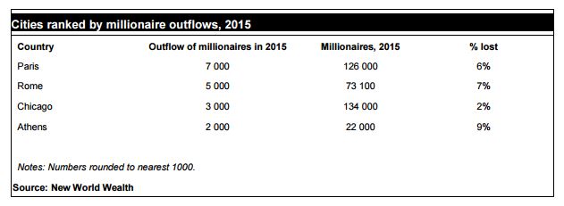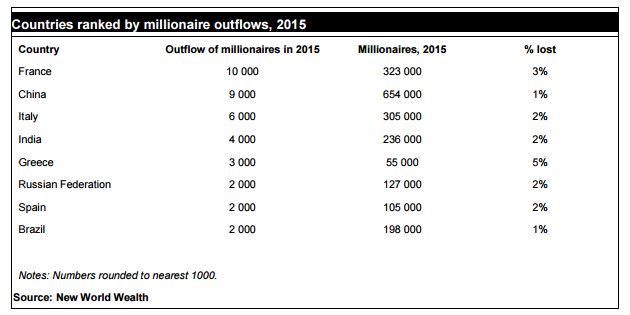 Πρώτη στην κλίμακα είναι η Γαλλία καθώς 10.000 εκατομμυριούχοι έφυγαν από τη χώρα το 2015.