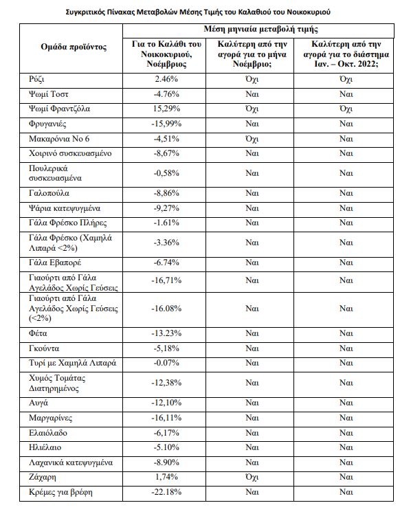 Όπως προκύπτει από την έρευνα, στα προϊόντα στο «Καλάθι του Νοικοκυριού» καταγράφηκε τον Νοέμβριο μείωση της μέσης τιμής (μέσος όρος) κατά -6,45%, της διάμεσης τιμής (μεσαία τιμή στην κατάταξη των τιμών του κάθε προϊόντος) κατά -6,32% και της κατώτατης τιμής κατά -6,56%, ενώ το ίδιο διάστημα οι τιμές των αντίστοιχων κατηγοριών (ομοειδών) προϊόντων στην αγορά αυξήθηκαν κατά 0,90%, άρα το όφελος είναι ακόμη μεγαλύτερο για τον καταναλωτή. Επισημαίνεται ότι στο 10μηνο Ιανουαρίου-Οκτωβρίου 2022 ο μέσος μηνιαίος ρυθμός αύξησης των τιμών των αντίστοιχων αγαθών ήταν 1,43%.