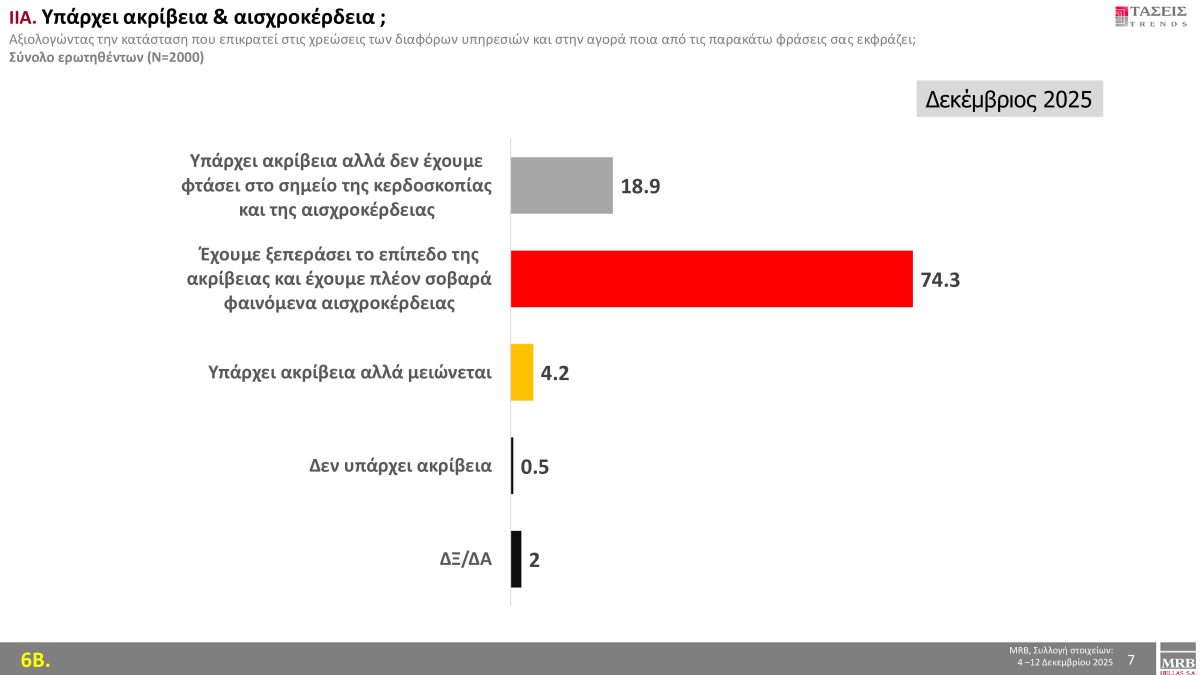 Επίσης, το 74.3 % απαντά ότι «έχουμε ξεπεράσει το επίπεδο της ακρίβειας και έχουμε πλέον σοβαρά φαινόμενα αισχροκέρδειας».