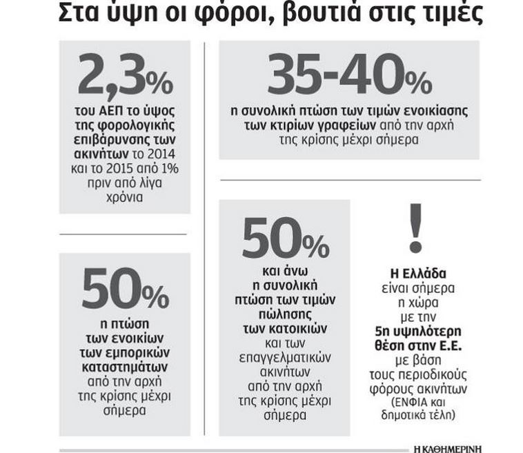 Απώλειες της τάξεως των 2 τρισ. ευρώ έχει υποστεί η αξία της ακίνητης περιουσίας των Ελλήνων από την αρχή της οικονομικής κρίσης από το 2008 μέχρι σήμερα, λόγω της μείωσης των τιμών όλων των κατηγοριών ακινήτων κατά 50%, αλλά και της ματαίωσης επενδύσεων που θα διεύρυνε την αξία τους.