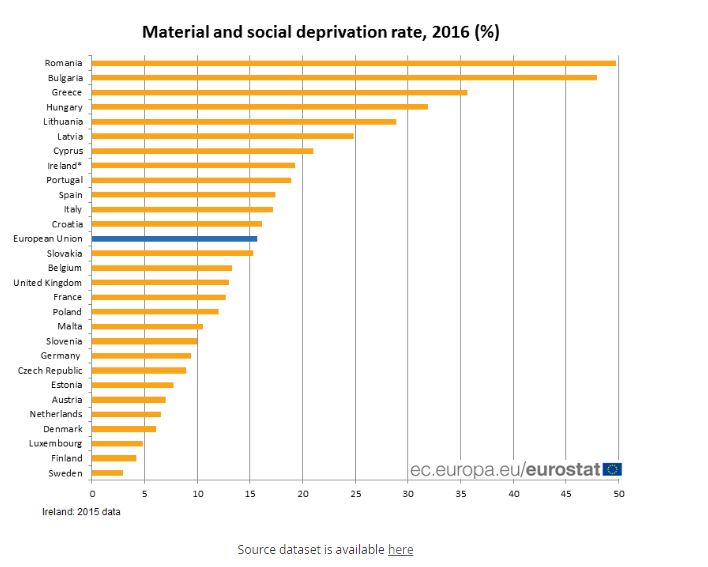 Την περασμένη χρονιά το 16% του πληθυσμού της Ε.Ε. (75 εκατ. άνθρωποι) δεν είχε τη δυνατότητα να αποκτήσει ή να απολαύσει βασικά υλικά και κοινωνικά αγαθά.