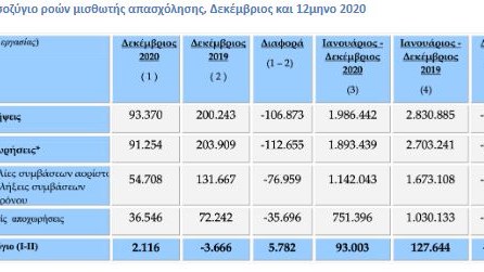 Θετικό (+93.003 θέσεις) ήταν το ισοζύγιο της μισθωτής απασχόλησης και για το σύνολο του έτους 2020, καθώς αθροιστικά το προηγούμενο έτος καταγράφηκαν 1.986.442 προσλήψεις και 1.893.439 αποχωρήσεις. Λαμβάνοντας υπόψη και τα στοιχεία του ΟΑΕΔ από τις χειρόγραφες υποβολές η τελική τιμή του ισοζυγίου ροών μισθωτής απασχόλησης για το 2020, διαμορφώνεται στις 85.954 θέσεις εργασίας. Οι εξελίξεις στην αγορά εργασίας αντανακλούν τις επιπτώσεις της πανδημίας, αλλά και τα άμεσα μέτρα που έλαβε η κυβέρνηση για την προστασία των θέσεων εργασίας και την στήριξη εργαζομένων και επιχειρήσεων.