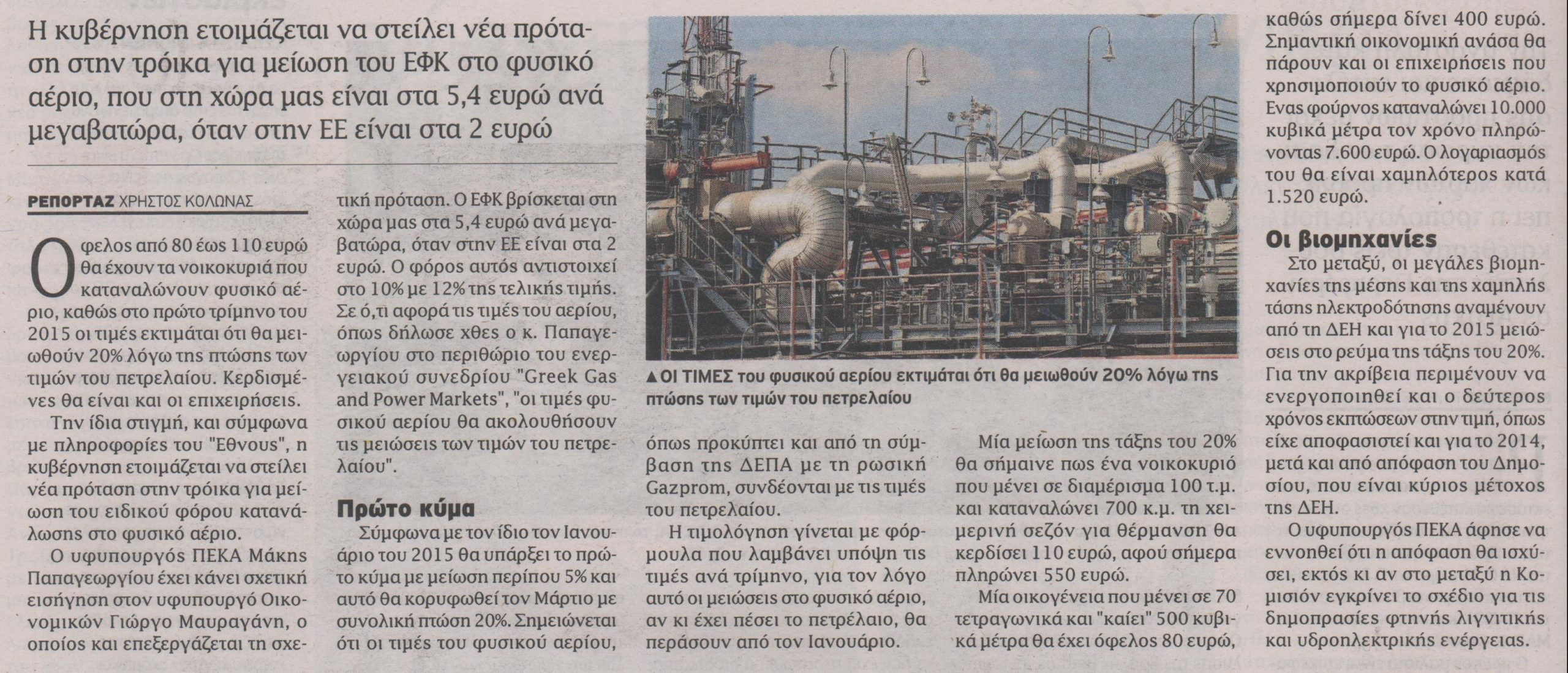 Όφελος από 80 έως 110 ευρώ θα έχουν τα νοικοκυριά που καταναλώνουν φυσικό αέριο, καθώς στο πρώτο τρίμηνο του 2015 οι τιμές εκτιμάται ότι θα μειωθούν 20% λόγω της πτώσης των τιμών του πετρελαίου. Κερδισμένες θα είναι και οι επιχειρήσεις.