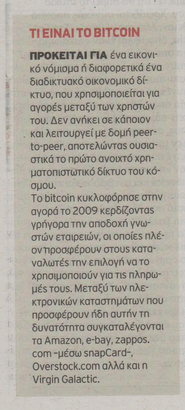 Τα πρώτα του…βήματα και στην Ελλάδα αναμένεται να κάνει το bitcoin, το νέο ψηφιακό νόμισμα που επιτρέπει τις άμεσες πληρωμές από το καλοκαίρι, παρά το γεγονός ότι το…κανόνι που χτύπησε ένα από τα βασικά ανταλλακτήρια του νέου εικονικού νομίσματος πριν από λίγο διάστημα θορύβησε πολλούς απ’ όσους το είχαν έως τώρα προτιμήσει.