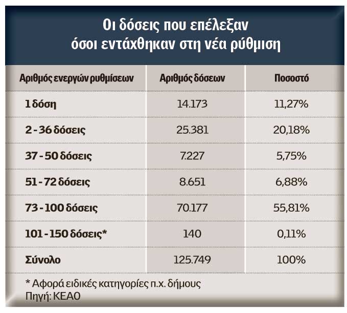 Εως και τον Μάρτιο του 2015 οι εισπράξεις μέσω της ρύθμισης του ν. 4305/14, στη οποία είχαν ενταχθεί και παρέμειναν 54.396 οφειλέτες για 1,1 δισ. ευρώ, ήταν 95,6 εκατ. ευρώ, ενώ με τη νέα ρύθμιση του ν. 4321/15 (με την οποία 128.716 ρύθμισαν οφειλές 3,8 δις ευρώ) έφτασαν μέσα σε 4 μήνες (Μάρτιος ? Ιούνιος) τα 151,4 εκατ. ευρώ. Η συντριπτική πλειοψηφία των οφειλετών (70.177 σε σύνολο 125.749, ποσοστό 55,81%) «μπήκε» και παραμένει στη ρύθμιση των 100 δόσεων για την οποία, ωστόσο, αναμένονται ανατροπές μετά τις εκλογές, καθώς θα τεθούν εισοδηματικά κριτήρια. Οι συνολικές εισπράξεις από την έναρξη λειτουργίας του ΚΕΑΟ τον περασμένο Ιούνιο ξεπέρασαν τα 670 εκατ. ευρώ (τα 358 εκατ. ευρώ είχαν εισπραχθεί έως τις 31/12/2015). Εως τον Ιούνιο είχαν ληφθεί αναγκαστικά μέτρα για την είσπραξη 8,6 δισ. ευρώ (έναντι 3,7 δισ. ευρώ που ήταν έως τα τέλη του 2014).