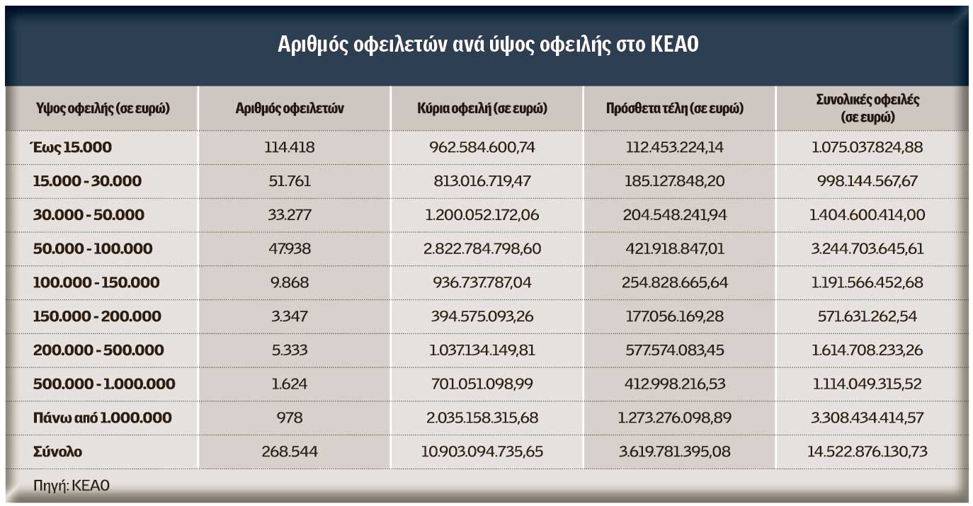 Οι οφειλέτες του ΚΕΑΟ σε ποσοστό 74,30% (οι 199.456) χρωστούν έως 50.000 ευρώ και συνολικά 3,4 δισ. ευρώ, δηλαδή όσο είναι το χρέος των μεγαλο-οφειλετών με χρέος άνω του 1 εκατ. ευρώ (978 επιχειρήσεις ή το 0,36% του συνολικού αριθμού των οφειλετών). Εως 15.000 ευρώ χρωστούν 114.418 (το 43%), το 19,27% χρωστά από 15.000 ? 30.000 ευρώ και το 12,40% ποσά από 30.000 ευρώ έως 50.000 ευρώ.