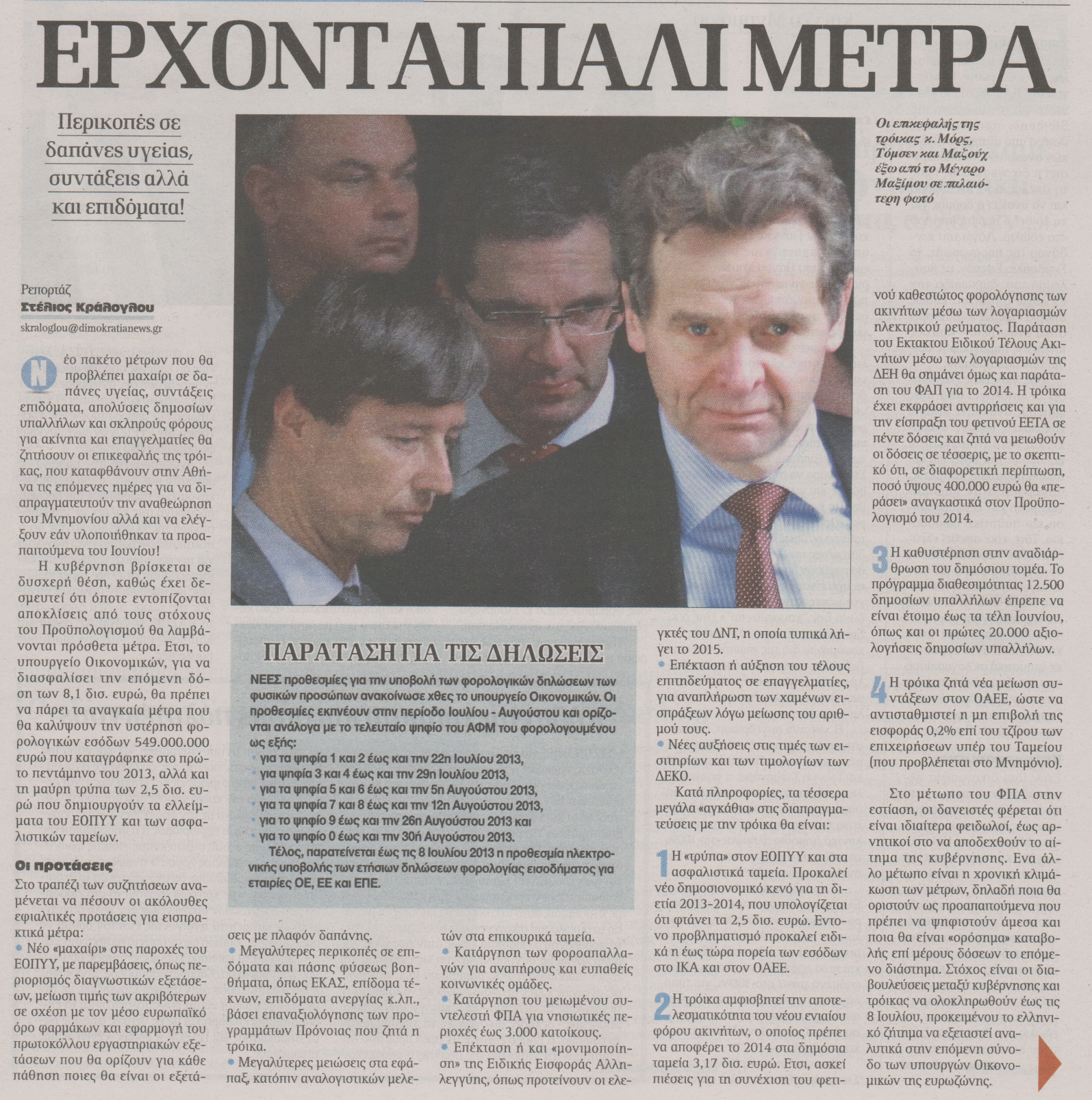 Νέο πακέτο μέτρων που θα προβλέπει μαχαίρι σε δαπάνες υγείας, συντάξεις, επιδόματα, απολύσεις δημοσίων υπαλλήλων και σληρούς φόρους για ακίνητα και επαγγελματίες θα ζητήσουν οι επικεφαλής της τρόικας, που καταφθάνουν στην Αθήνα τις επόμενες ημέρες για να διαπραγματευτούν την αναθεώρηση του Μνημονίου αλλά και να ελέγξουν εάν υλοποιήθηκαν τα προαπαιτούμενα του Ιουνίου!
