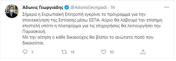 Την Παρασκευή 14 Μαΐου θα ανοίξει η πλατφόρμα για την υποβολή αιτήσεων επιδότησης για την αγορά πρώτων υλών στο πλαίσιο επανεκκίνησης της εστίασης. Όπως είχε προαναγγείλει νωρίτερα με ανάρτησή του στο Twitter, ο υπουργός Ανάπτυξης και Επενδύσεων, Άδωνις Γεωργιάδης “σήμερα η Ευρωπαϊκή Επιτροπή εγκρίνει το πρόγραμμα για την επανεκκίνηση της εστίασης μέσω ΕΣΠΑ. Αύριο θα λάβουμε την επίσημη επιστολή οπότε η πλατφόρμα για τις επιχειρήσεις θα λειτουργήσει την Παρασκευή. Με την αίτηση ο κάθε δικαιούχος θα βλέπει το ανώτατο ποσό που δικαιούται”.