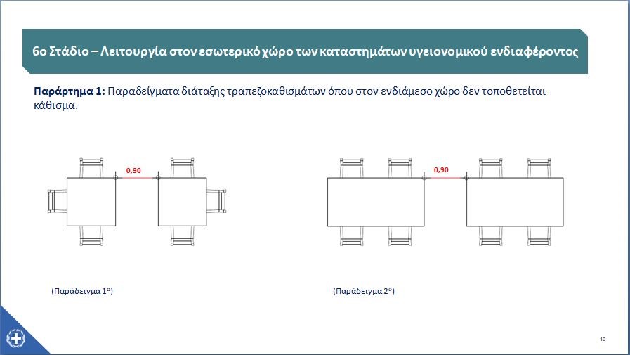 Παράλληλα, καθορίζεται ως ελάχιστη απόσταση μεταξύ των τραπεζιών σύμφωνα με την διάταξη των καθισμάτων ως εξής : α. Όταν στον ενδιάμεσο χώρο μεταξύ δύο παράπλευρων τραπεζιών δεν τοποθετείται καρέκλα σε κανένα εκ των δύο τότε η ελάχιστη απόσταση μεταξύ αυτών ορίζεται στα 0,90 μ.