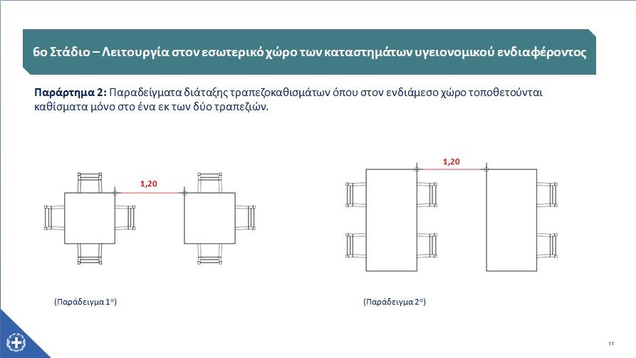 β. Όταν στον ενδιάμεσο χώρο μεταξύ δύο παράπλευρων τραπεζιών τοποθετείται καρέκλα σε ένα εκ των δύο τότε η ελάχιστη απόσταση μεταξύ αυτών ορίζεται στα 1,20 μ.