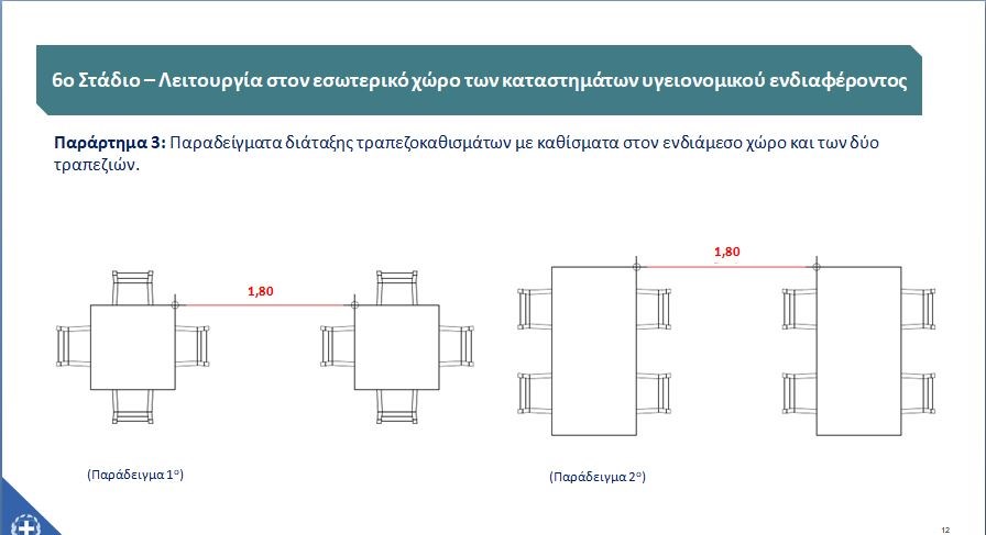 γ. Όταν στον ενδιάμεσο χώρο μεταξύ δύο παράπλευρων τραπεζιών τοποθετείται καρέκλα σε κάθε ένα εκ των δύο τότε η ελάχιστη απόσταση μεταξύ αυτών ορίζεται στα 1,80 μ.