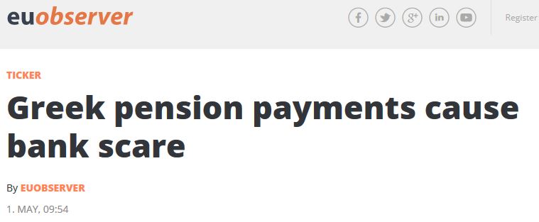 Η Ελλάδα πιέζεται βρει χρήματα για να πληρώσει δυο δόσεις του ΔΝΤ ύψους 1 δισ. ευρώ, στις 6 και 12 Μαϊου, την ώρα που προσπαθεί να ανταποκριθεί στις πληρωμές μισθών και συντάξεων σε συνθήκες περιορισμένης ρευστότητας.