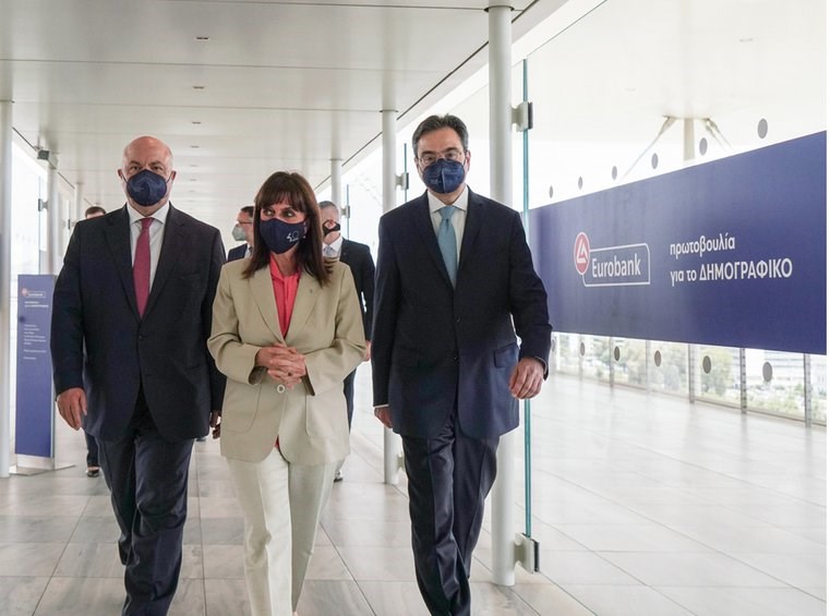 H Α.Ε. Πρόεδρος της Δημοκρατίας Κατερίνα Σακελλαροπούλου με τον Πρόεδρο του Διοικητικού Συμβουλίου της Eurobank, κ. Γιώργο Ζανιά και τον Διευθύνοντα Σύμβουλο της Eurobank, κ. Φωκίωνα Καραβία