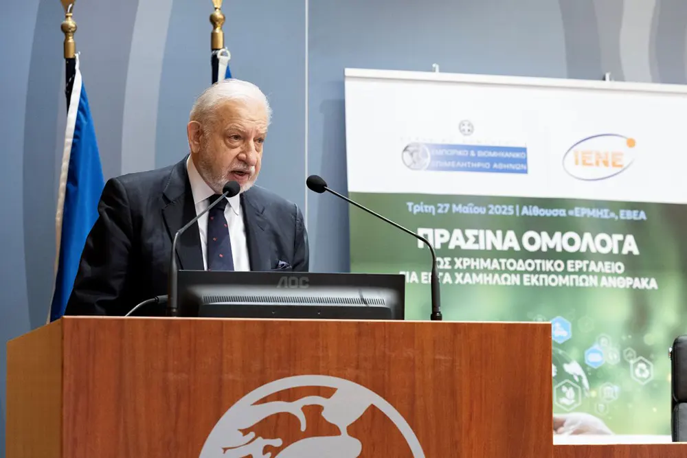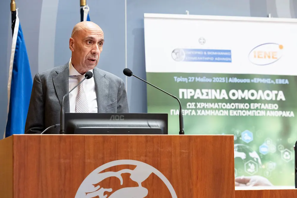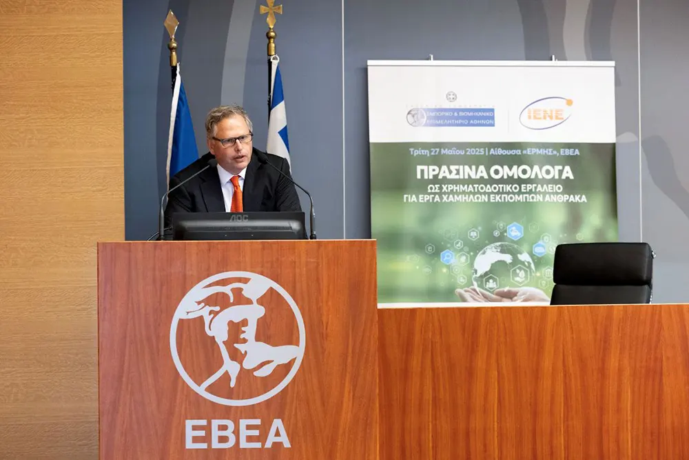 Το Εμπορικό & Βιομηχανικό Επιμελητήριο Αθηνών (ΕΒΕΑ) και το Ινστιτούτο Ενέργειας ΝΑ Ευρώπης (ΙΕΝΕ) διοργάνωσαν χθες, Τρίτη 27 Μαΐου 2025, ενημερωτική εκδήλωση με θέμα «Τα Πράσινα Ομόλογα ως Χρηματοδοτικό Εργαλείο για Έργα Χαμηλών Εκπομπών Άνθρακα».