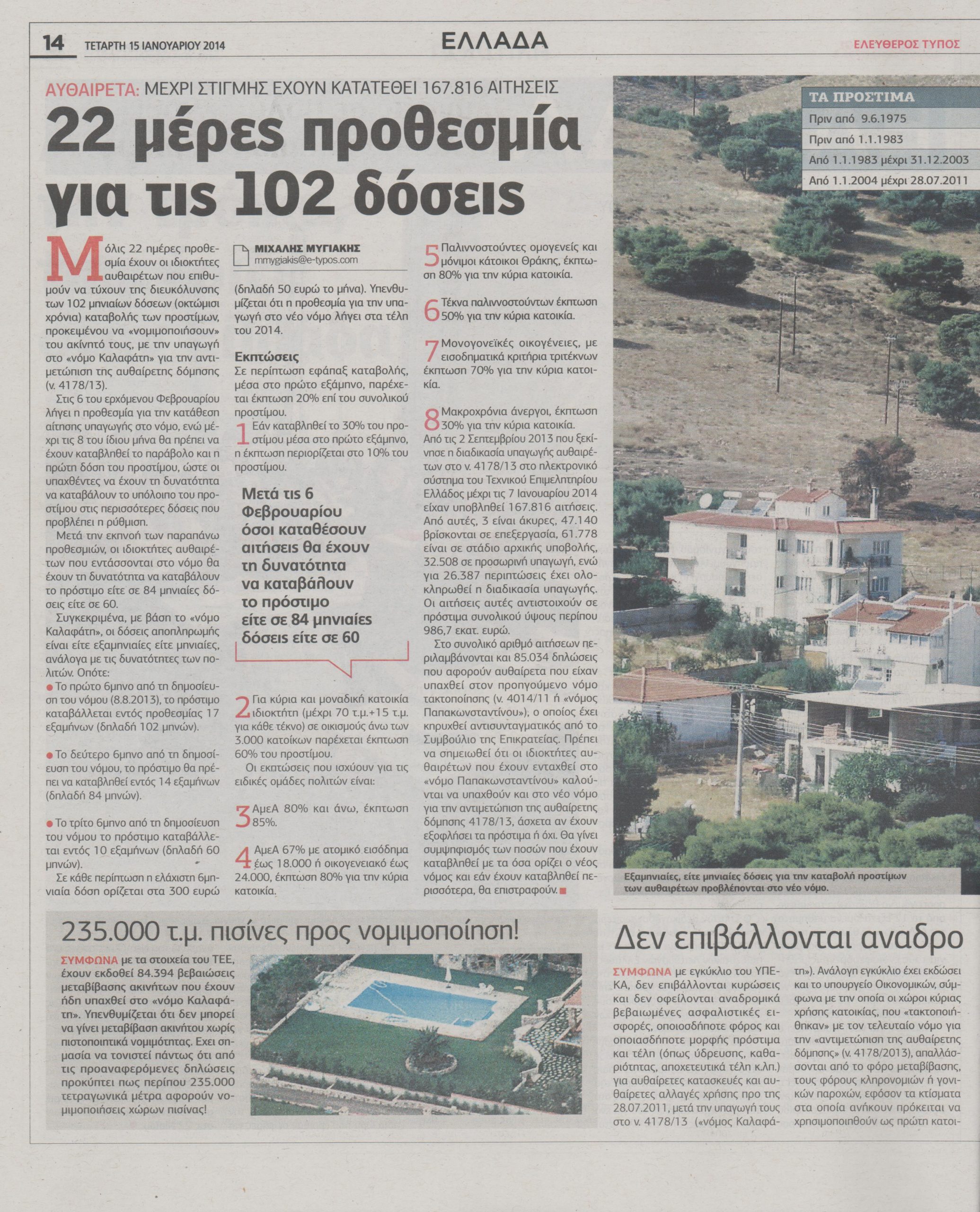 Μόλις 22 ημέρες προθεσμία έχουν οι ιδιοκτήτες αυθαιρέτων που επιθυμούν να τύχουν της διευκόλυνσης των 102 μηνιαίων δόσεων (οκτώμισι χρόνια) καταβολής των προστίμων, προκειμένου να «νομιμοποιήσουν» το ακίνητό τους, με την υπαγωγή στο «νόμο καλαφάτη» για την αντιμετώπιση της αυθαίρετης δόμησης (ν.4178/13).