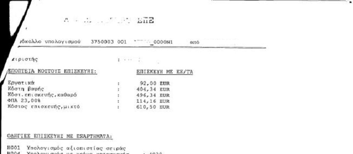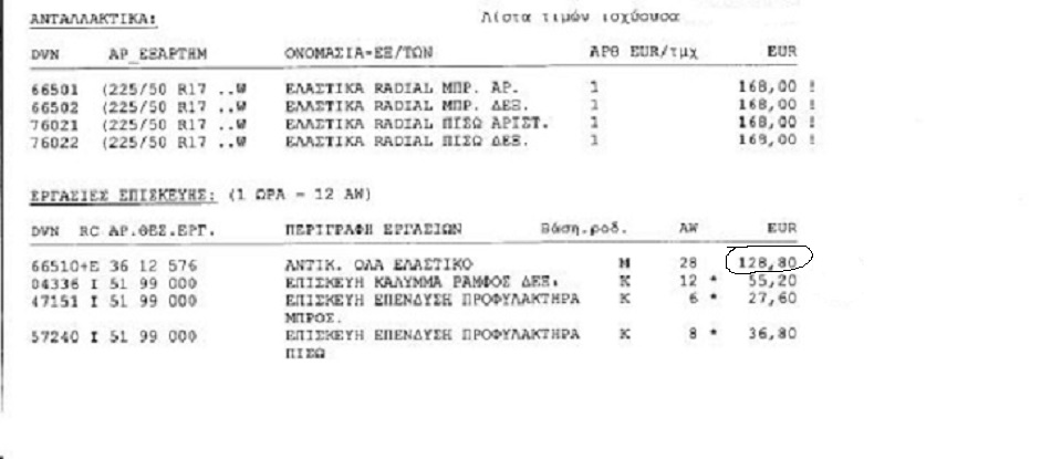 Ωστόσο από όλες τις χρεώσεις η κορυφαία όλων αφορούσε στην αντικατάσταση των ελαστικών η οποία χρεώθηκε με 128,80 ευρώ!