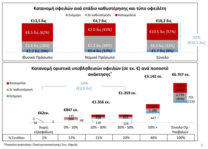 • 54% (3,6 δισ. ευρώ) της συνολικής οφειλής των οριστικά υποβληθεισών αιτήσεων έχει εξασφάλιση μικρότερη του 50%, εκ των οποίων το 92% (3,3 δισ. ευρώ ) βρίσκεται σε στάδιο καθυστέρησης ή/και καταγγελίας