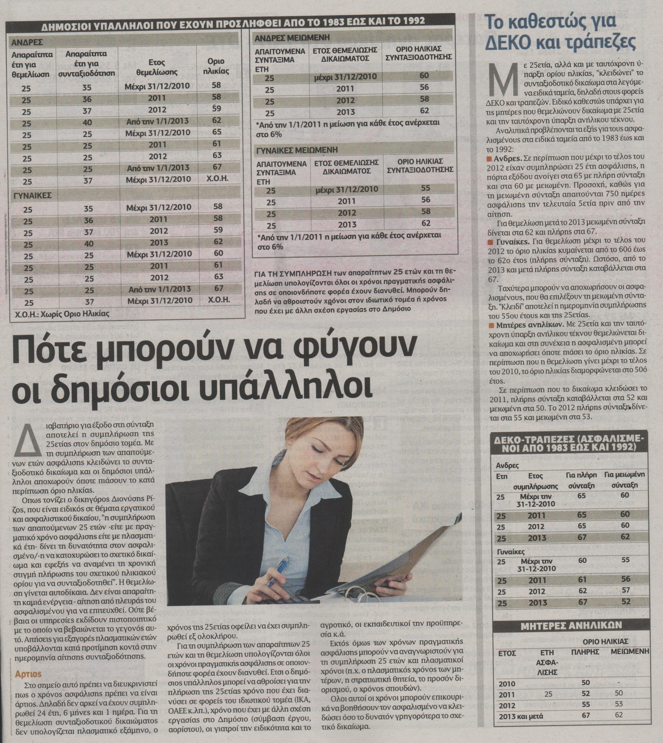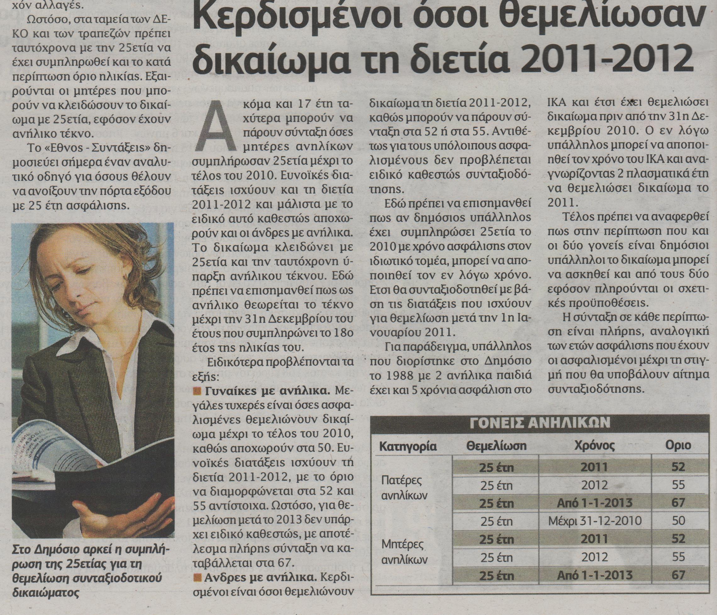 Σύνταξη με 25ετία δικαιούνται 120.000 ασφαλισμένοι στο Δημόσιο, στα ταμεία των ΔΕΚΟ και στους φορείς των τραπεζών. Κερδισμένοι είναι όσοι θεμελιώνουν δικαίωμα μέχρι το τέλος του 2012, καθώς υπάρχουν ευνοϊκές ρυθμίσεις όσον αφορά στα όρια ηλικίας για τη συνταξιοδότηση.