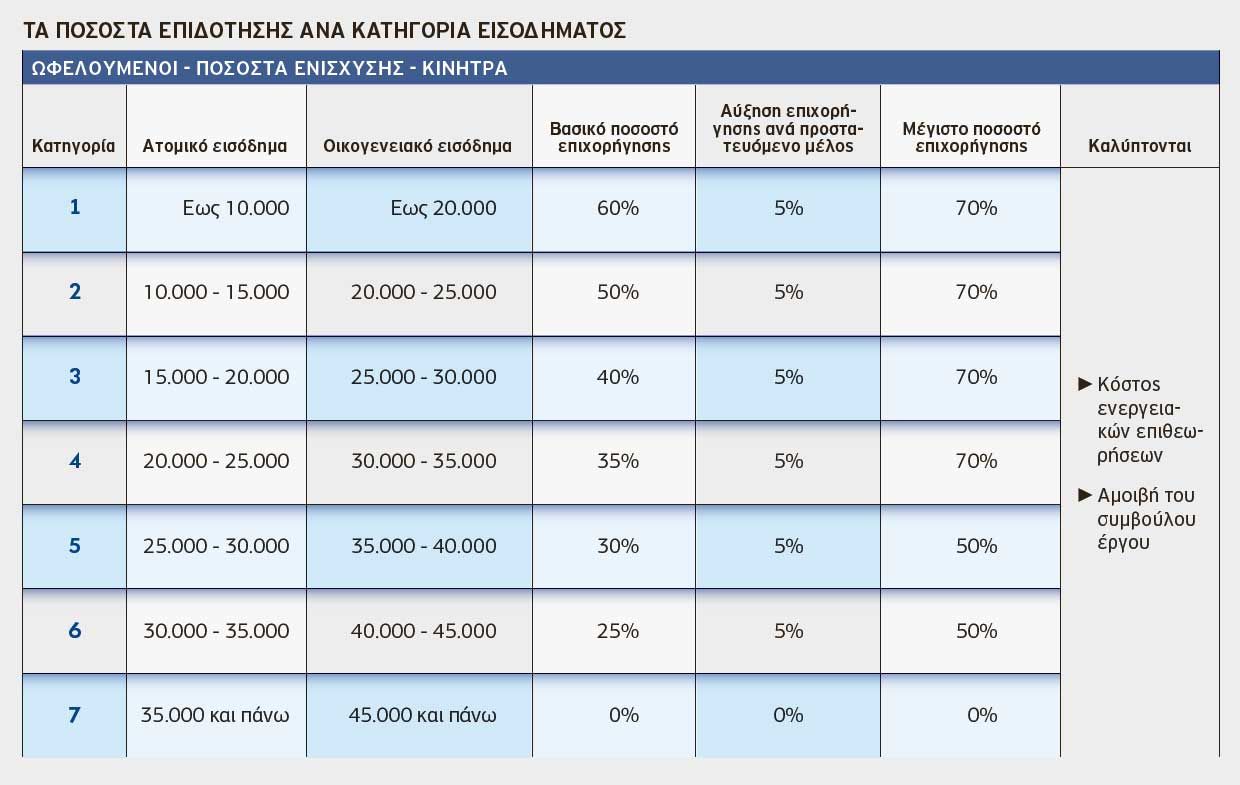 Τα ποσοστά επιχορήγησης φτάνουν έως και 70% και κλιμακώνονται ανάλογα με το ύψος του εισοδήματος και τον αριθμό των προστατευόμενων μελών. Οσο πιο χαμηλό είναι το εισόδημα τόσο υψηλότερο είναι το ποσοστό επιδότησης. Αυτό ξεκινά από 25% και ανεβαίνει κατά 5% ανά παιδί.
